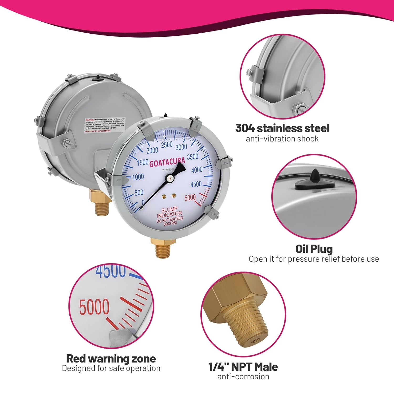 "DescriptionGOATACURA Slump Gauge for concrete and construction industry, construction machinery field, municipal and infrastructure projects Dial Size: 4"" Thread Size: 1/4"" NPT Pressure Range: 0-5000psi, single scale Accuracy: +/-2-1-2%, comply with ANSI B40.1 (Grade A) standard, with accuracy test report Connection Location: Lower mount Connection Material: Brass Case: 304 stainless steel case Filling: Glycerin filled, enhance vibration and shock resistance, extend product life Dial: Aluminum, white Pointer: Aluminum, black Window: Polycarbonate Ingress Protection: waterproof"