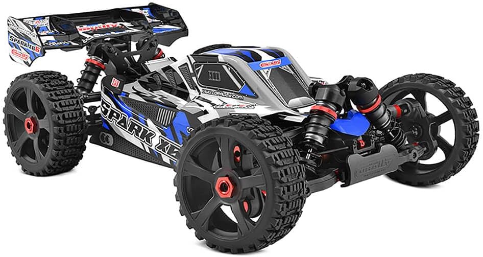 The 1/8 Scale Spark XB6 6S Buggy from Team Corally is a true powerhouse, combining cutting-edge technology and rugged construction to provide an unmatched off-road experience. This off-road beast has been meticulously re-designed, updated, and improved on 46 different points to provide you with unparalleled performance and durability. With its attractive, racing-inspired design, this buggy is not only a powerhouse but also a head-turner. Whether you're a seasoned basher or a newcomer to the RC world, this buggy is ready to push the limits of performance and take on any challenge you throw its way. The precision CNC-manufactured aluminum parts, the beautiful red anodization, and the various small details make a big difference. Required to Complete: 1/8 Scale Steering Servo, 1/8 Scale ESC, 1/8 Scale Motor, 4-6S block or 2x2S and 2x3S LiPo batteries, appropriate charger, 2.4 GHz 2-channel radio system, and AA batteries for the transmitter. FEATURES: X-Treme Ultra-Rigid Hybrid Chassis Brace System: A new design features an X-treme ultra-rigid hybrid chassis brace system at the front, center, and rear, providing exceptional chassis support and rigidity. Oversized HD Composite Suspension Arms: Equipped with oversized HD 13mm thick composite suspension arms featuring aluminum anti-tear rings, this buggy can handle rough terrain with ease. Oversized HD Composite "Pillow Ball" Steering Blocks: These HD composite steering blocks have been re-engineered to prevent the pop-out of steering balls under extreme loads, ensuring precise and responsive steering. Oversized Composite Steering and Rear Camber Links: The updated design includes oversized composite steering and rear camber links for improved stability and control. CNC-Machined Aluminum Components: The buggy boasts CNC-machined 5mm aluminum shock tow