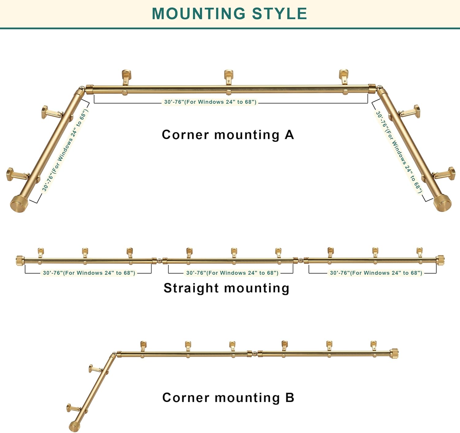 Mayrhyme 1 1/8 inch Premium Bay Window Curtain Rods Elevate your bay windows with Mayrhyme 1-Inch 2 sided 36-72 Inch bay window curtain rods & 3 sided 20-36 & 36-72 & 20-36 Inch corner window curtain rods and enjoy a seamless and stylish window treatment solution 1.Our rod features sturdy aluminum ends that ensure longevity and a sleek appearance 2.Our innovative brackets allow you detach and adjust to fit distance from the wall 3.The robust zinc alloy connector ensures a seamless transition around corners, maintaining stability while enhancing the aesthetic appeal of your window treatments 4.With a substantial 1 1/8 inch diameter, our rod offers a bold presence that complements heavier drapes and curtains, providing a perfect blend of strength and elegance 5.Whether you're hanging sheer panels or thick drapes, our adjustable design allows for versatility in any setting. Upgrade your home decor with our Premium Corner Curtain Rod and enjoy the perfect combination of durability, style, and flexibility. Perfect for living rooms, bedrooms, or any space needing an elegant touch!