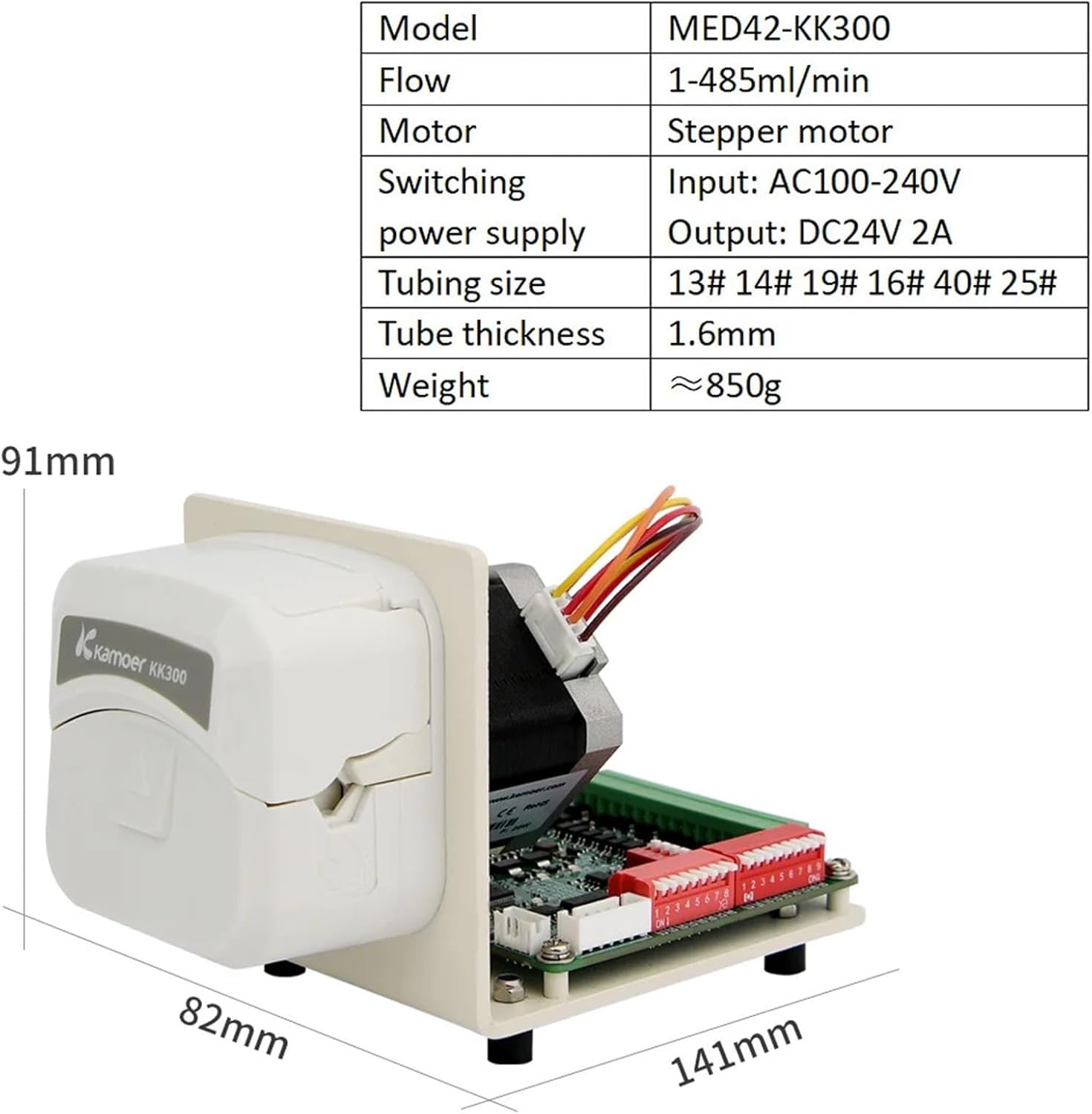 Water PumpsMED42-KK300 High Flow Embedded Peristaltic Pump 24V Stepper Motor Adjustable Dosing Pump 1-485ml/min Support CAN/RS485Basic ParametersMED42-KK300 Peristaltic Pump Stepper motorVoltage24V(2A)Flow ml/min1-485ml/minPower(Max)36WMaximum speed400RPM (software can be set)Speed control resolution0.1RPMFunctionsContinuous Mode/Semi-Automatic/Fully AutomaticSize141x82x93mmExternal control0 ~5V , 0 ~10V , 4 ~20mA , 0 ~10khz , DIP switch speed regulation, rotary encoder speed regulation, button speed regulation, R S485 controlMotor lifetime6000HWeight850gOptional tubingBPT(1000H)/Silicone(200H)Language settingsNoneOptional accessoriesDigital tube displayRotary encoderPower cord connectorTube diameterID:inner diameterOD:outer diameterSpeed range(RPM)Flow rate(ml/min)Tubing lifetime(Hours)B16ID3.2 x OD6.4mm4001901000HS16ID3.2 x OD6.4mm400170200HS25ID4.8xOD8.0mm400315200HS40ID4.0 x OD7.2mm400235200HVarious ApplicationMedical fieldPrinting&3DChemical industryAnalytical instrumentsCleaning and disinfectionStepper motor Precise control Builtindriver boardInterface definition1. Quick connect terminal2. Mode & address dial3 Current speed DIP switch4 Rotary encoder for speed regulation and setting)5. Button interface (5 buttons)6. Indicator connector (3 LEDs)7. Digital tube interface (4-digit digital tube)8. Fan control9. Stepper motor interface10. RS485/CAN communication selection dialQuick connect terminaldescription1. RS485A2. RS485B3. The place of communication4. 0~5V/10V5.4~20mA6. Analog ground7. Pulse input positive8. E