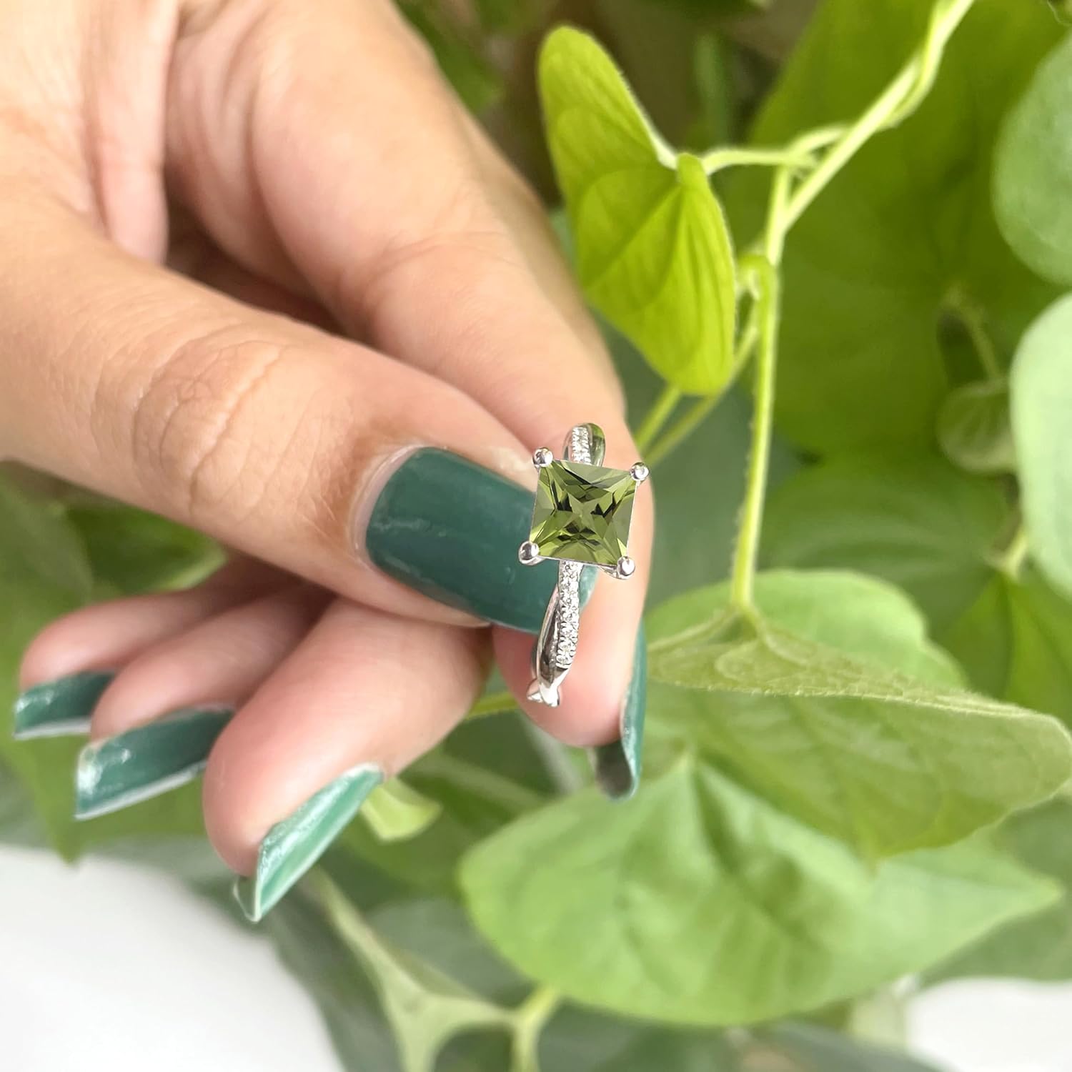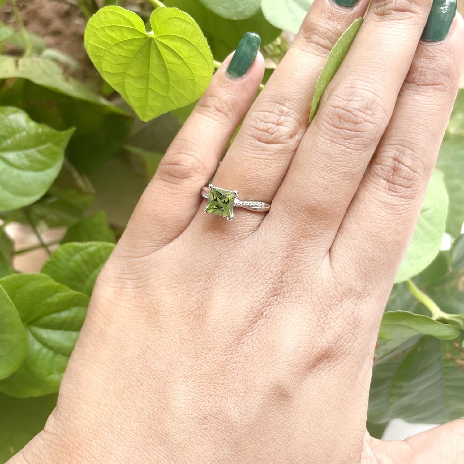 This Handmade Princess Shape Swirl Twisted Engagement Ring is made from high-quality 925 sterling silver, known for its lustrous appearance and durability.. It is available in 14K White, Yellow, and Rose Gold Plating with Highly Glossy Finished. It features Simulated Princess Cut Green Peridot Stones set in prong Setting. This Engagement Ring is easy to use, Perfect for any occasion.