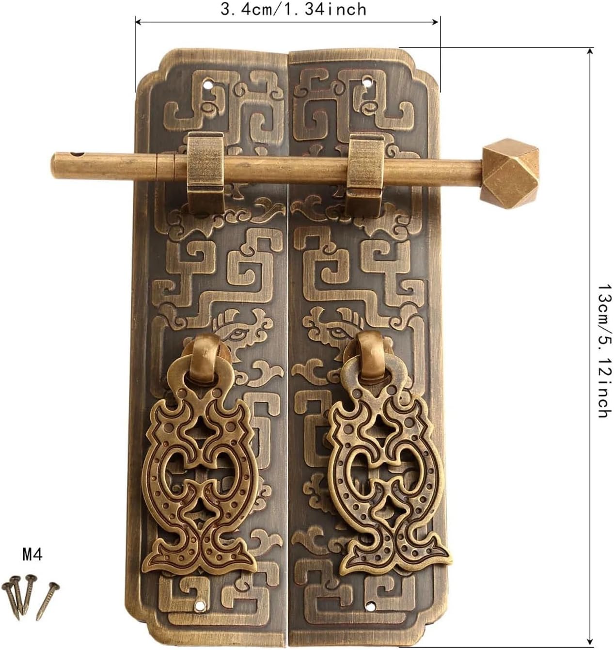 Door handleMaterial: Brass.Suitable for wood within 2cm/0.79".Face panel: 13*3.4*0.15cm(L*W*H)/5.12"*1.34"*0.06".Lock pin: 10.3*0.6cm/4.06"*0.24".Lock pin hole diameter: 3mm/0.12".Package list:1Set x Cabinet Strip Pull(1pair x panel;1 x bolt;2 x knob;2 x lock nose;4 x screws;4 x nails)