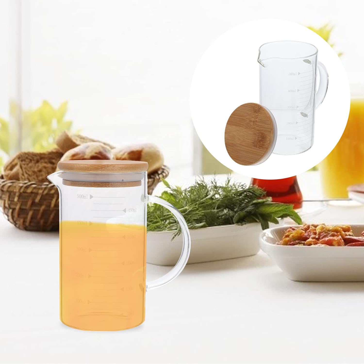 DAOUXIAOSPDescriptionHeat Glass Measuring Cup Thickened Glass Measure Cup with Wood CoverFeatures- Capacity: 500ml- Material: Glass.- Color: Transparent.- Size: 15X8. 5X8. 5CM.Package Including1 x cover1 x Glass Measuring Cup
