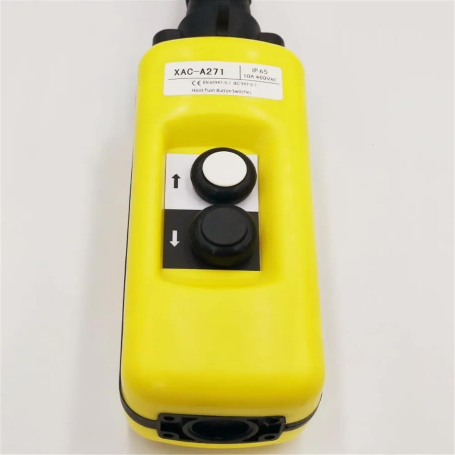 SwitchesSingle Speed Control Hoist 2 Pushbuttons Pendant Control StationRain proof1 speed controlShatter-resistantFire protected plasticMax voltage:660VACMax current:10AProtection level:IP65Model:XAC-271Environment temperature:-25°C ~+55 °C Air relative humidity : 85% Pollution grade:3,installation sort:III, protection grade:above IP655.Altitude : 2000m DC 380V, AC 220V