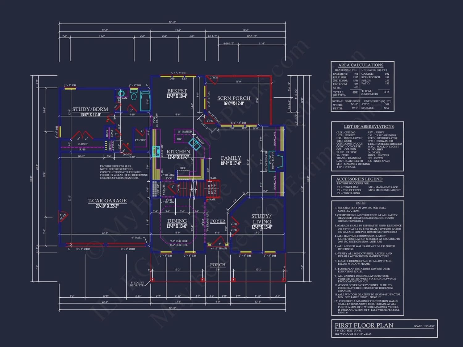 Width: 54′-10″Depth: 50′-0″Htd SF: 4,841Unhtd SF: 1,115Traditional 4 Bedroom Home Plan with 2 Car Garage | Floor Plans & BlueprintsThis traditional 4-bedroom home plan features 4,841 heated sq ft, a 2-car garage, and various amenities. Explore the floor plans, blueprints, CAD files, and architectural designs today!This traditional 4-bedroom house plan offers a perfect mix of comfort and functionality. Designed for modern living, it delivers timeless charm and smart space planning.Key Features of the Home PlanLiving Areas - Heated & UnheatedHeated area: 4,841 sq. ft. over 2 stories.Unheated extras: Includes a two-car garage, screened porch, and patio.Bedrooms & Bathrooms4 spacious bedrooms, including a luxurious Owner suite with a walk-in closet.4 full bathrooms strategically placed for privacy and ease.Interior HighlightsBasement: Offers versatile space for recreation or storage.Fireplace: Creates a warm and inviting atmosphere.Office/Study: Provides a dedicated workspace for those working from home.Attic & Recreational Room: Offers bonus space for various needs.9ft+ Ceilings: Creates a spacious and airy feel.Tray Ceilings: Adds architectural interest and elegance.Garage & Storage DetailsGarage Bays: 2-car garage with side entry.Storage: Includes attic storage, mudroom cubbies, and bonus closet space.Outdoor Living FeaturesCovered front and rear porches for shaded outdoor enjoyment.Exterior features like shake or siding for Craftsman curb appeal.Architectural Style: TraditionalThis design blends timeless materials and thoughtful details—perfect for families who value character and efficiency in one package. Learn more about the Traditional style or explore its roots on ArchDaily.Bonus FeaturesElevator for multi-level convenience.Breezeway connecting garage and main house.Flex room ideal for office, guest, or workout use.Included Benefits with Every