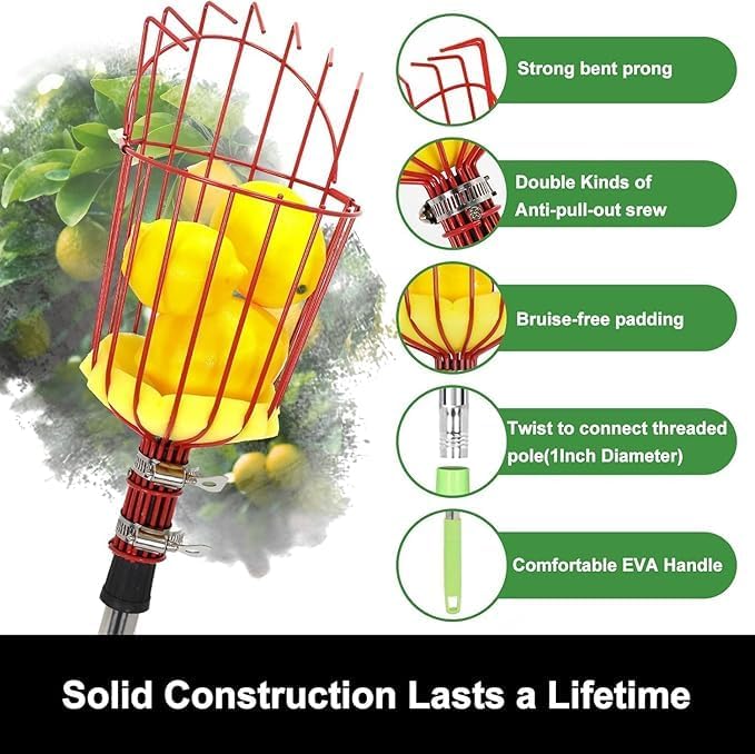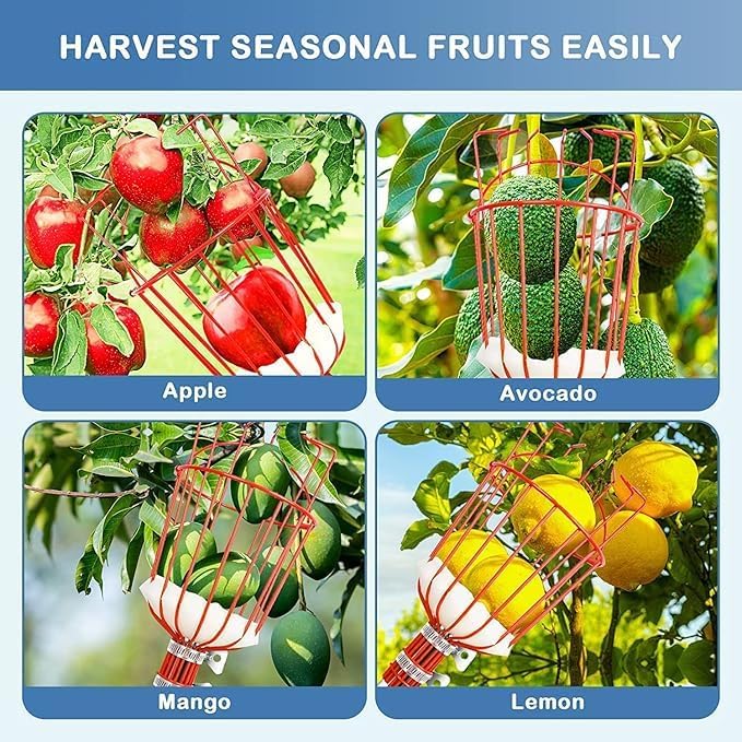 PRODUCT DESCRIPTION 1 Harvest tall trees safely—no ladder required! This 10-foot (120-inch) fruit and mango plucker combines an extendable pole, deep collection net, and reinforced grip to effortlessly pick mangoes, coconuts, citrus, and more.2 Designed for stability and ease, it eliminates risky climbs while protecting fruits from bruising.3 The telescopic extension adapts to various tree heights, while the heavy-duty net ensures zero drops. 4 Perfect for home gardeners, orchard owners, and coconut harvesters!