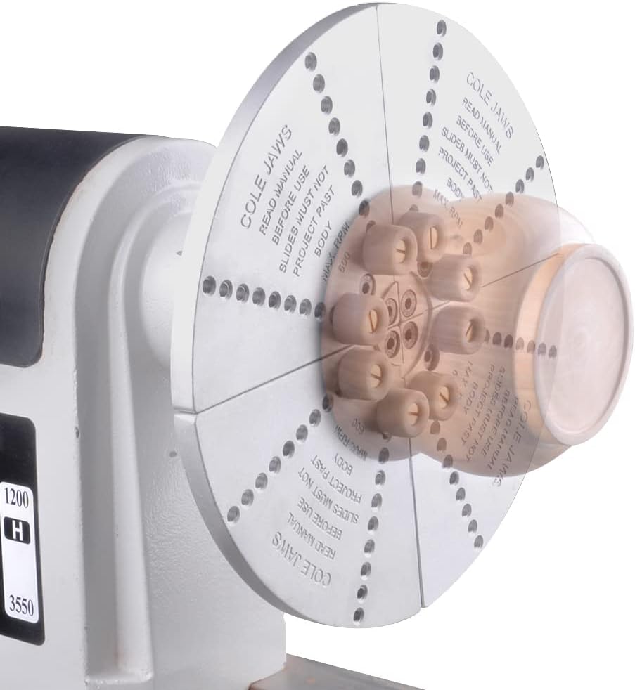 The Cole jaws are a very versatile set designed primarily for the re-chucking of bowls to remove chuck marks or to re-shape the bottom of bowls that have already been turned. The Cole Jaws come with a set of extra long mounting screws, which enables you to mount the 50mm, Step, and 100mm jaws onto the face of your Cole jaws, allowing you to do you bowl from start to finish with out changing jaws. All the facilities of the other jaw sets can be fully utilized in conjunction with the Cole jaws. These jaws more than any other really begin to explore the tremendous versatility of the Nova Chuck. However we all know too well that in removing a tenon from a workpiece the jaws tend to mar the surface but with the bumpers on the Cole jaws those hard marks are a thing of the past. The best thing with jaws such as these is you can use both compression or expansion to chuck a workpiece without spending time having to change jaws, readjust the bumpers and so forth.A special woodworm screw (optional) can be used for initial bowl mounting. With this combination of holding methods, it is possible to turn a bowl from rough blank to a completely finished smooth bowl with just this one jaw set. The Chuck Cole jaw combination is the only chucking system to allow such a complete facility without any complex jaw changes or different set ups. There are a number of re-chucking options; false wooden jaws can be added, wooden dowels used or rubber stoppers which are provided with the basic kit.