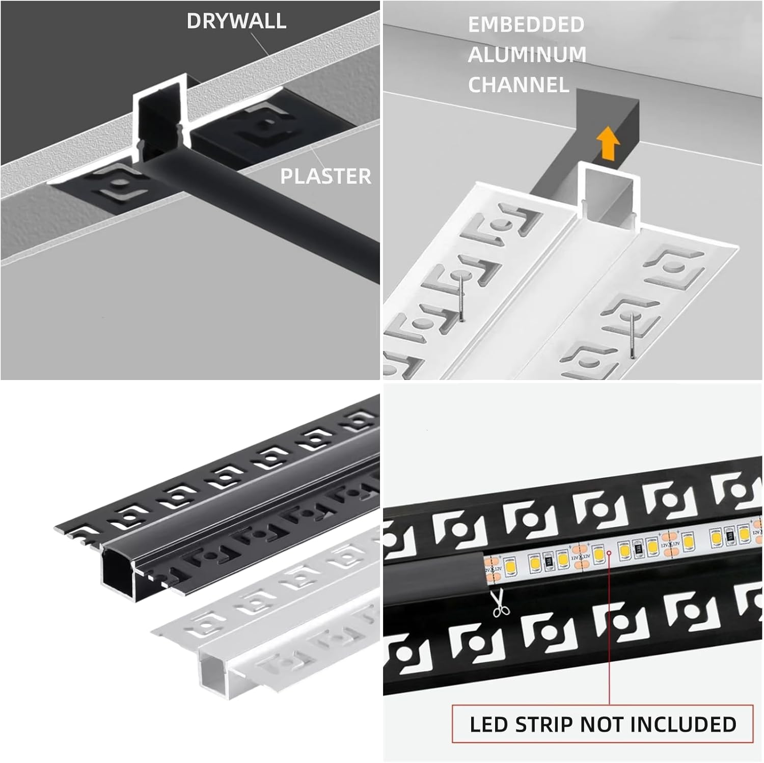 Name: Aluminum channelMaterial: 6063 aluminumColor: BlackCover: PC black cover/milky white coverIndoor outdoor usage: Indoor usageInstallation: Plaster in embeddedLED strip: less than 8mmNote: LED Strip not included