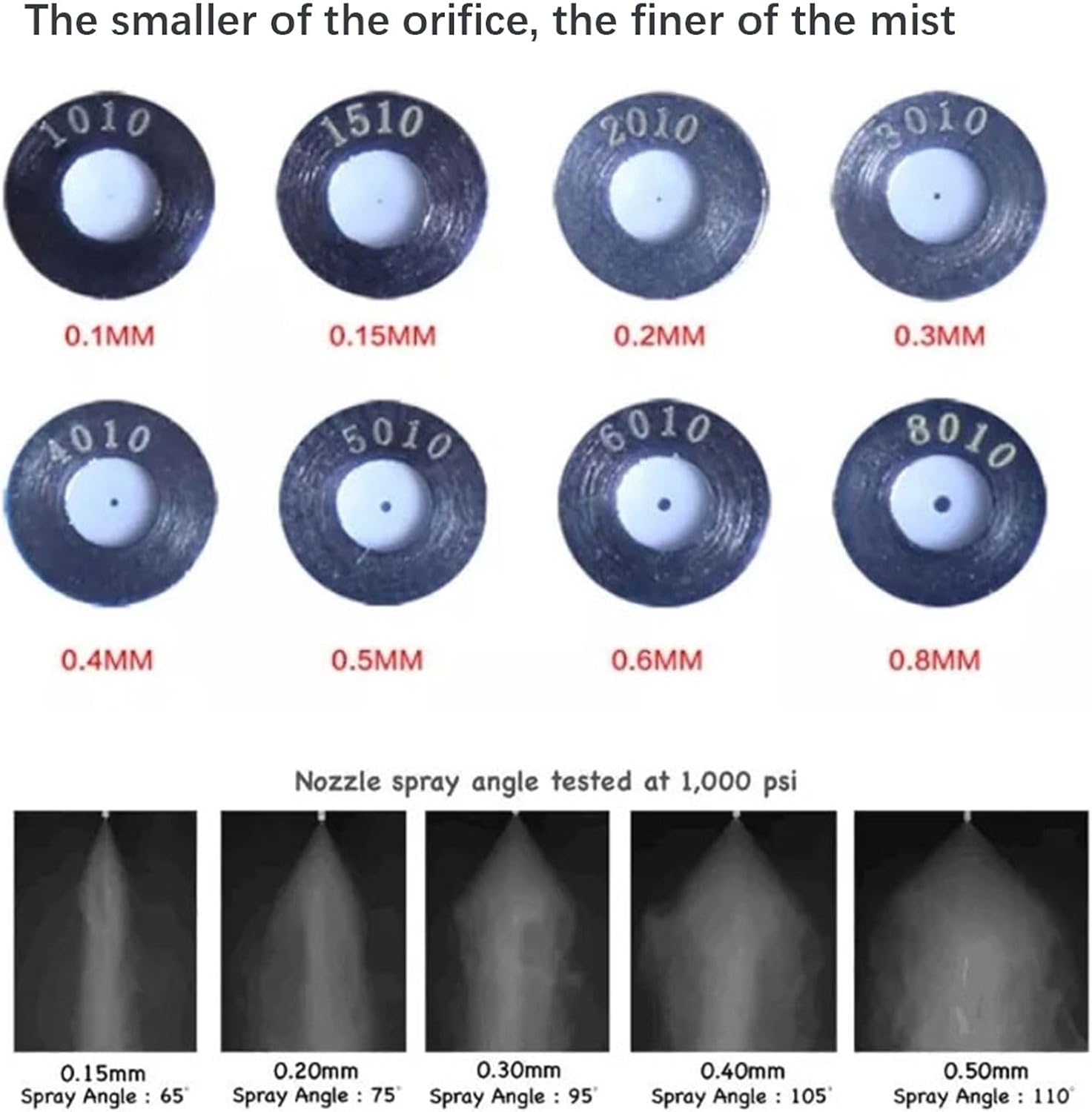 - Nozzle specification:● Name: High pressure mist nozzles● Material: Brass coated with nickle body +Ceramic Head● Thread size: 10-24UNC (3/16'')● Feature: Anti-drip, With filter● Application pressure: 20 to 70 bar(280PSI---1000PSI)● Spray particle size of around 50 microns● Orifice dia: 0.1mm,0.15mm,0.2mm,0.3mm0.4mm,0.5mm,0.6mm,0.7mm,0.8mm,0.9mm,1.0mm● Flow rate: 0.02 lpm - 0.06 lpm● Usage: Irrigation, humidification, dust removal, cooling, landscaping.- Tee specification:● Name: 3/8''High Pressure Slip-Lock Fitting For Mist Nozzle● Material: brass body with nickel plated● Type: Quick coupling/Quick release● Thread hole: 2 holes at 120 degrees● Thread size: 10-24UNC (3/16'')● Interface size:3/8"(9.52mm)● Working pressure: 20bar-120 bar(280PSI---1740PSI)● Application: For high pressure nozzle● Suitable pipe size: 3/8", Outer diameter 9.52mm pipe● Function: Connect the pipe fix the nozzle end the water● The quick connector can be connected to PE/PA pipes or slotted stainless steel pipes, making it easy to install and leak free- Packaging includes● The packaging includes: 10 Nozzle+10 tee- Application● Wet cleaning Air humidifying;● The chemical treatment Chemical sprays;● Evaporative cooling flue gas Fruit spray wax;● Parts of cooling Salt spray test;● The workshop humidifying Artificial fog;● Other places humidification;