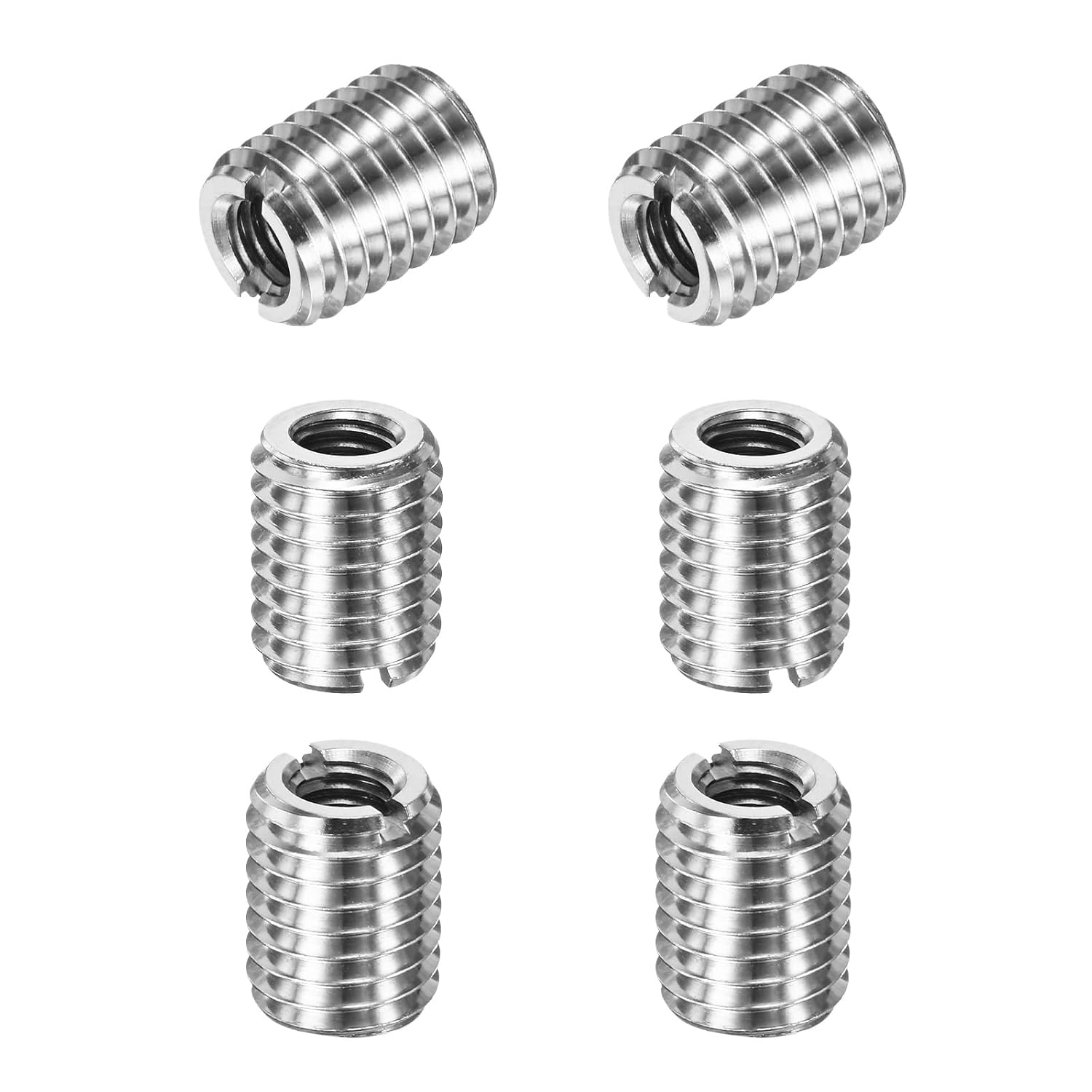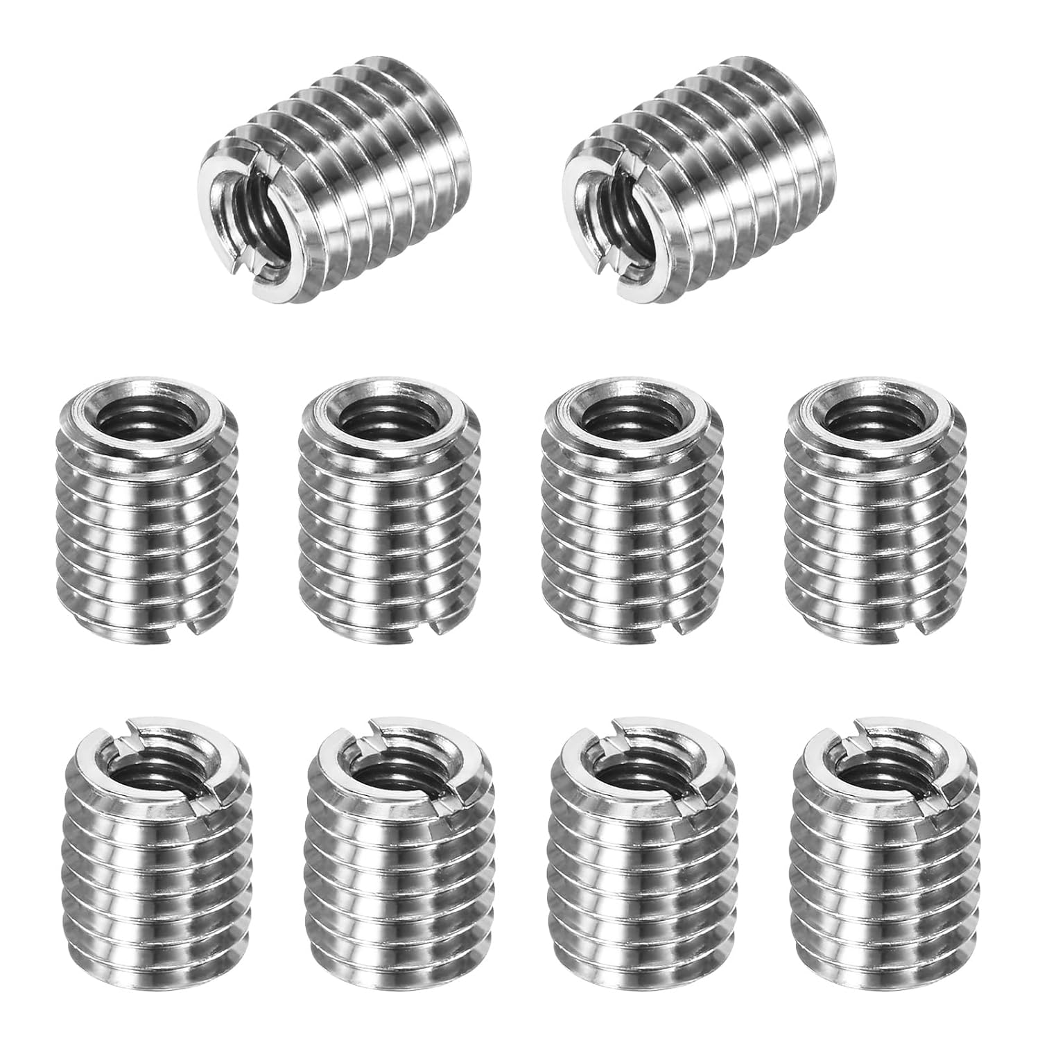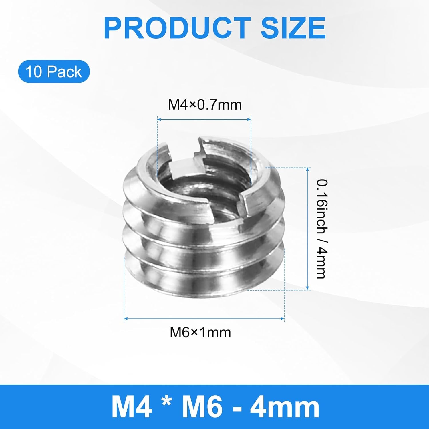 PRODUCT APPLICATIONSThese threaded inserts provide reliable thread repair solutions for industrial fastening systems across multiple industries. Perfect for aviation, automotive, and electronics applications, they effectively restore damaged threads while preventing loosening. Their versatile design makes them great for computer components, lighting equipment, and heat sinks.PRODUCT DETAILS & INCLUDES√ Material: 303 Stainless Steel√ Color: Silver√ Female Thread: M4×0.7√ Male Thread: M6×1√ Thickness: 4mm/0.16"√ Package Includes: 10Pcs x Thread Reducer NutPRODUCT ADVANTAGES1. This screw reducer conversion is made from 303 stainless steel for superior durability and performance. It provides excellent corrosion and rust resistance, ensuring long service life even in harsh conditions. With precise manufacturing to specifications, it delivers reliable strength and a perfect fit every time.2. The adoption of thread reducing nuts can significantly enhance the connection strength and stability. Its uniform load distribution design can effectively eliminate tooth deviation, absorb mechanical vibration.INSTALLATIONWhen installing, nut repair inserts can be easily completed with just a flat-head screwdriver. The specially designed slot on the top is convenient for tool insertion. The repair process for damaged threads has been simplified, enabling rapid installation and disassembly.