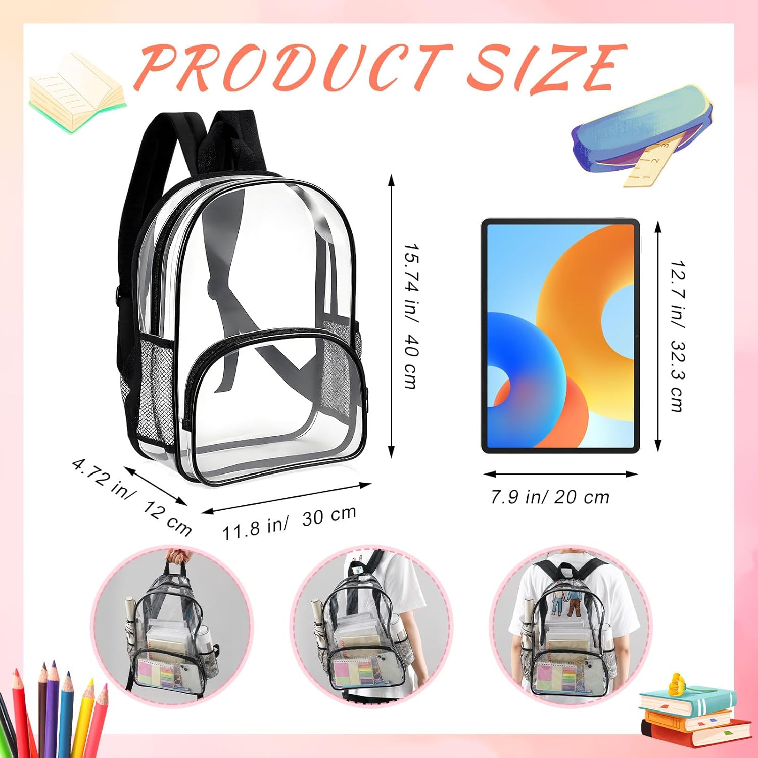 • Large Capacity: each clear bookbag measures about 15.7 x 11.8 x 4.7 inches/ 40 x 30 x 12 cm, and features with multiple compartments, which provides enough space for your essentials and convenient organization for easy access; It can hold books, notebooks, pens, mobile phones, tablets, calculators, water bottles, wallets, keys and more