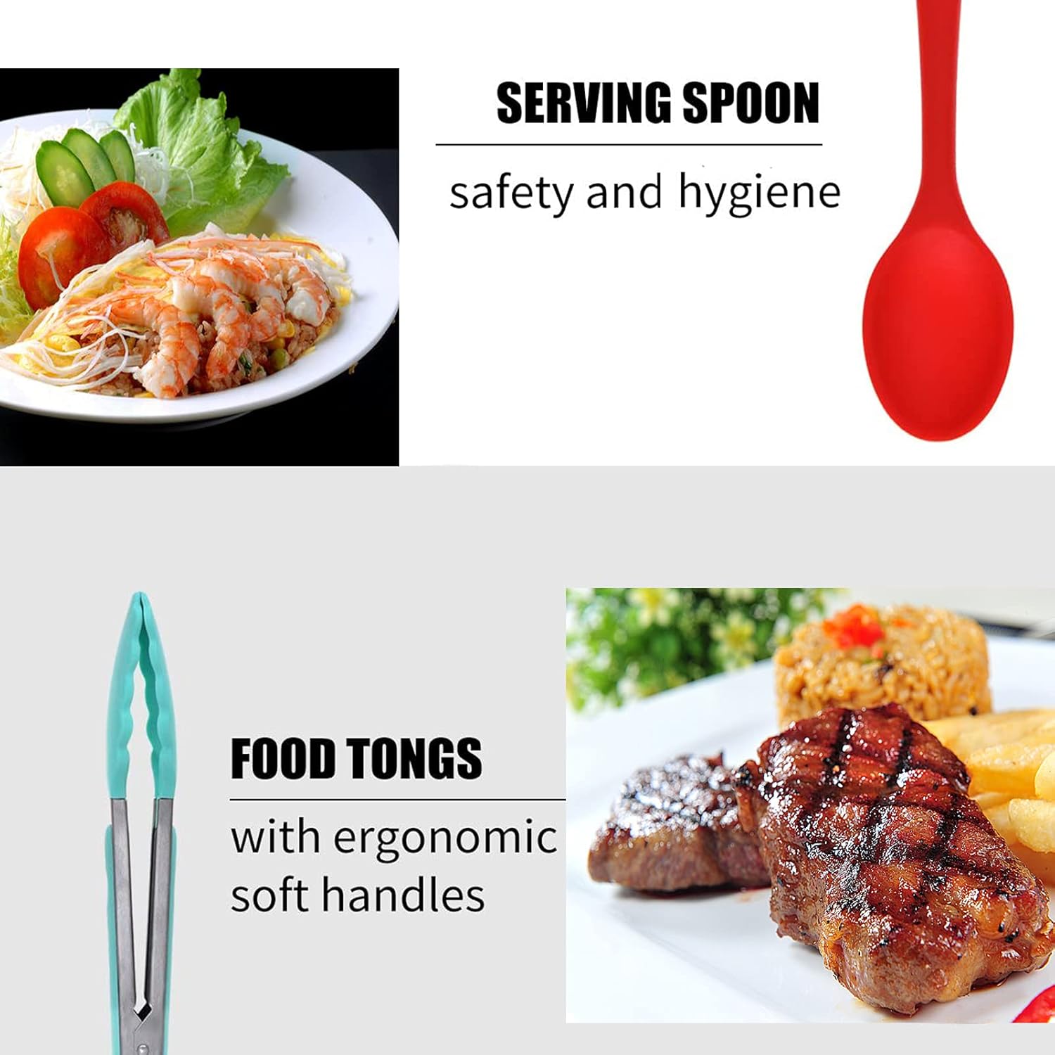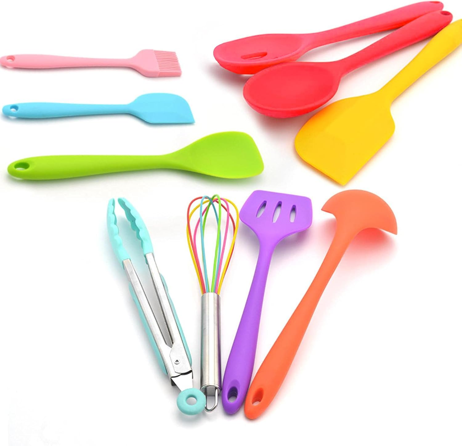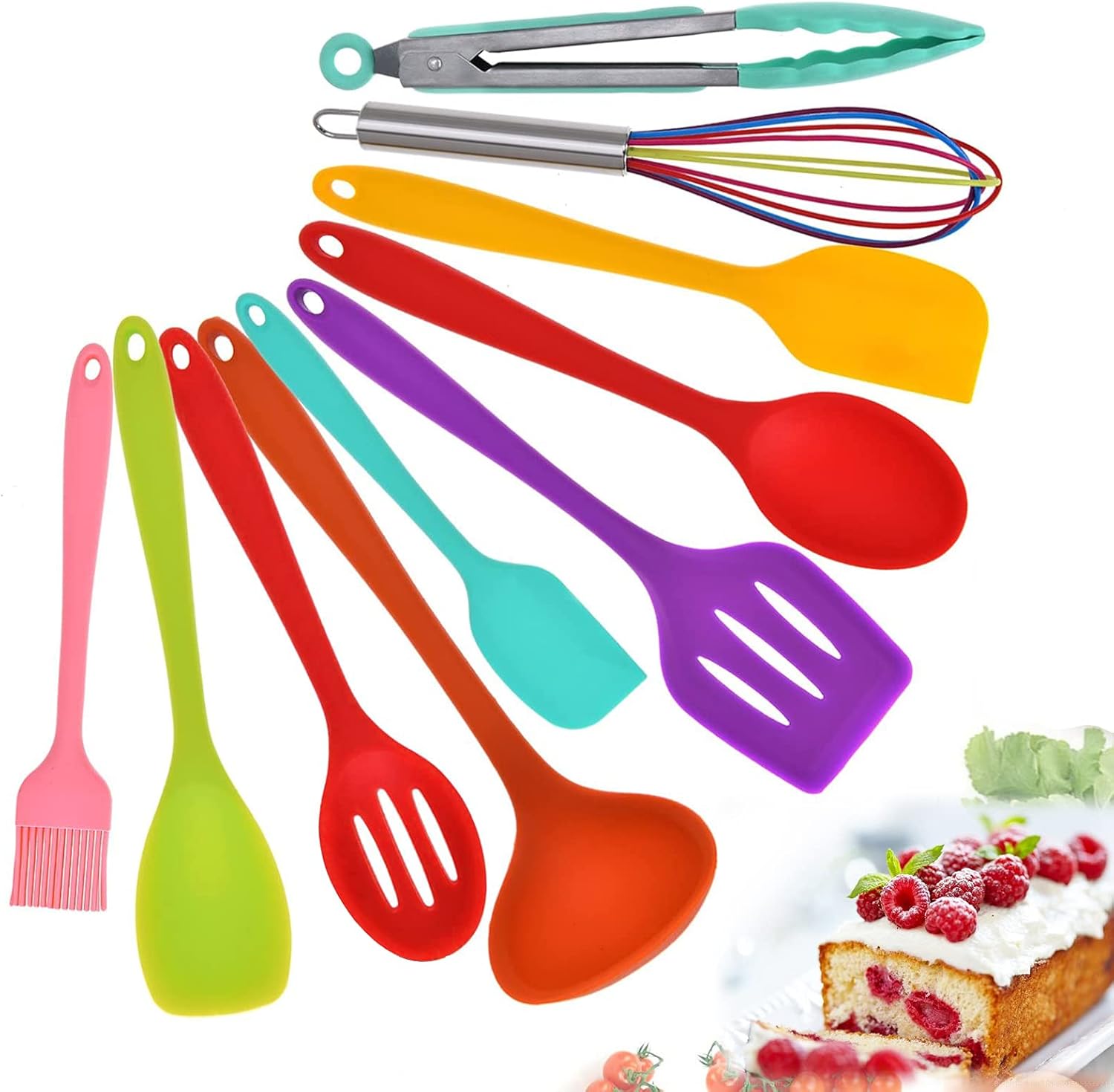 Details: Color: color Material: Silicone Product features:, hygienic, non-sticky, durable, safe, and easy-to-clean kitchen utensils Adaptation temperature: low temperature -40 degrees Celsius, high temperature +230 degrees Celsius Product Size: Food tongs 10.6 inx1.6 in Whisk 10 inx2.2 in Small brush 8.4in x 1.3 in Large scraper 10.6 inx 2.2 in Small scraper 8 inx 1.6 in Colander 10.8 inx 2.3 in Butter spatula 10.6 inx2.5 in Shovel 11.9 inx 3.1 in Tablespoon 11 inx 5.3 in Spoon 10.6 in x 2.3 in Quantity: 10 pieces Package Included: 10 X Silicone kitchenware