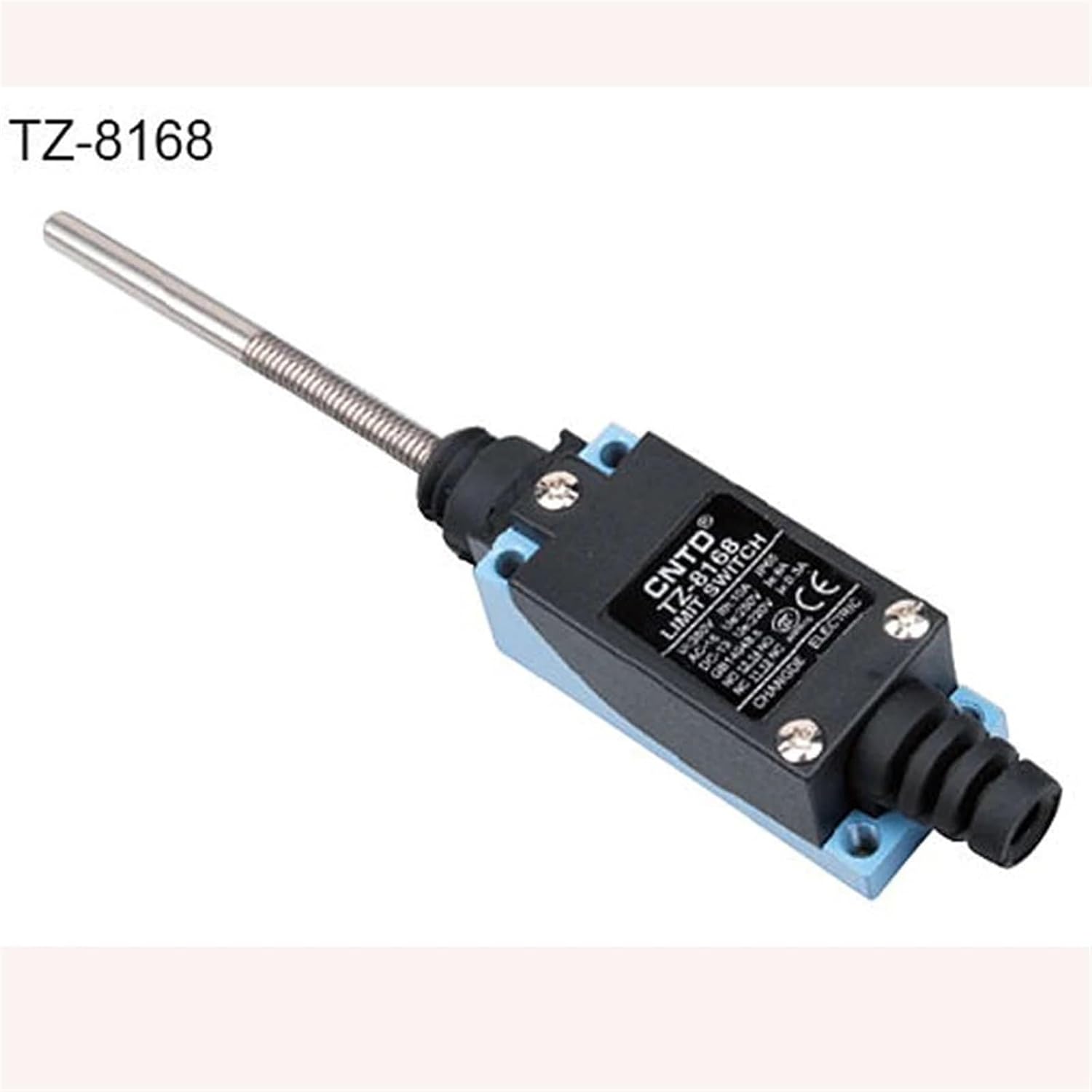 SwitchesFeaturesDouble circuit type of limit switchHighly rigid construction, consists of intensive plastic and aluminumcast (Head and cover snugly fit in box)Small volume, water-proof and oil-proof constructionBuilt-in basic switch with double spring mechanism, longer mechanical lifeSmooth operation with greater OTEasy-to-wire circuit opening designWide varity of actuators, easily useRatingsRatedvoltageNoninductive Load (A)Inductive Load (A)Resistance LoadLamp LoadInductive LoadMotor LoadNCNONCNONCNONONC125VAC250VAC55551.51 0.70.5333321.510.88VDC14VDC30VDC125VDC250VDC5550.40.25550.40.2333 333 544 444 333 333 Inrush CurrentN.C: below 24A, N.O: below 12ANOTES:1.Inductive load has a power factor of 0.4 min.(AC) and a time constant of 7 msec.max.(DC).2.Lamp load has an inrush current of 10 times the steady-state current,while motorload has an inrush current of 6 times the steady-state current.3.Product with spring, its usable range of operating part is within one third of thewhole spring length from the front end of spring.CharacteristicsOperation speed0.5mm-50cm/secOperating frequencyMechanical: 120 operations/minute Electical: 30 operations/minuteContact resistance25m max. initial valueInsulation resistance100m min. below 500VDCDielectric strength1000VAC, 50/60 Hz for 1 minute between terminals of the same polarity1500VAC, 50/60 Hz for 1 minute between current-carrying and noncurrent-carrying metal parts1500VAC, 50/60 Hz for 1 minute between each terminal and groundVibration10-55Hz,1.5mm double amplitudeShockMechanical : 1, 000m/Sec2 (about 100G'S)Malfunction: 300m/Sec2 (about 30G'S)Ambient temperature-5~+65(With no icing)Humidity<;95% RHWeightAbout 130 to 190gLifeMechanical: 10,000,000 operations aboveElectrical: 500,000 operations aboveDegree of protectionIP65Operating CharacteristicsModelsTZ-8104TZ-8108TZ-8107TZ-8111TZ-8112/8122TZ-8166/8167/8168/8169OF(Max.)750g750g750g900g900g150gRF(Min.)100g100g100g150g150g- PT(Max.)20°20°20°1.5mm1.5mm30mmOT(Min.)50°50°50°4mm4mm- MD(Max.)12°12°12°1mm1mm- OP- - - 26±0.8mm37±0.8mm