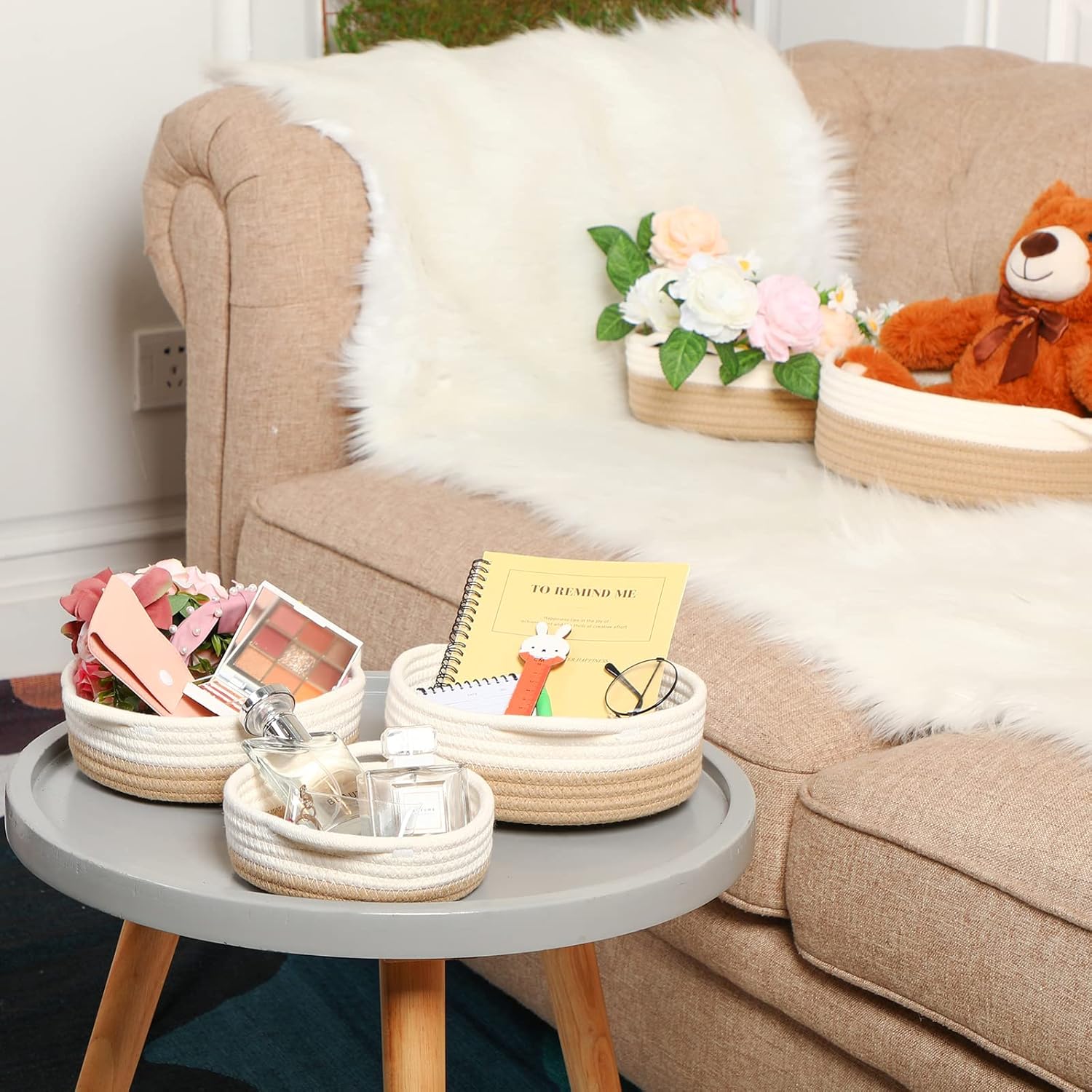Features: Strong and practical: These organizer baskets are woven precisely, making the baskets more compact and solid, which can stand for your long term use, you can use with confidence. Gift choice: These storage baskets for shelves can be applied as a sweet gift for your loved ones to show your love and care, and they will be happy and surprised to receive these gifts. Specifications: Main material: cotton threadColor: as shown in picturesSize: about 10 x 3.9 inches, 9.5 x 3.3 inches, 8.7 x 2.9 inches, 8.3 x 2.8 inches and 6.7 x 2.4 inchesPackage includes: 10 x Rope basketNotes: Manual measurement, please allow slight errors on size. The color may exist a slight difference due to different screen displays.