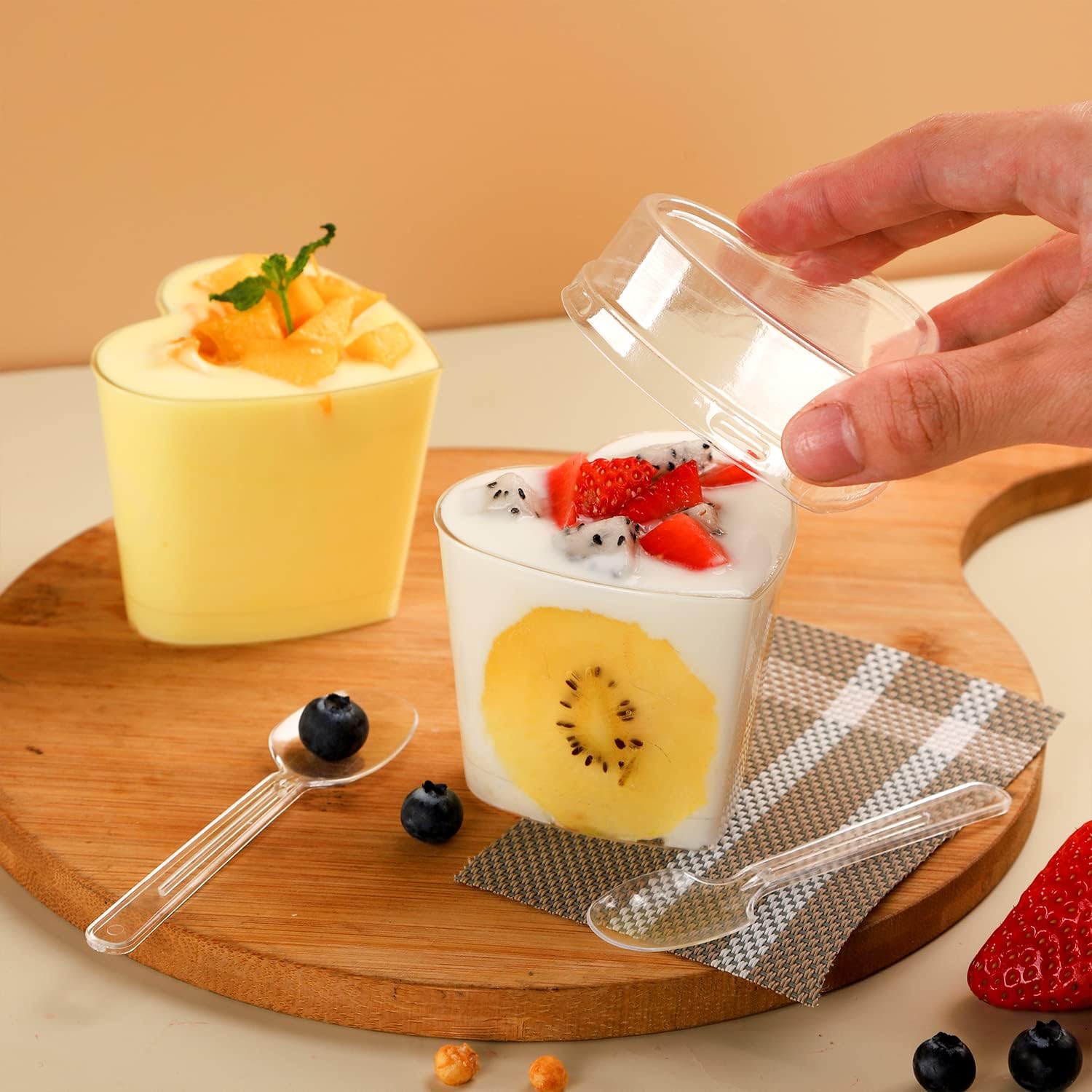 RAMFIYN 5-oz 100 count heart shaped clear dessert cups with lids and spoons. Show off your culinary creations with these Clear Heart Shaped Dessert Cups. Whether you are serving tiramisu, crème brulé, or chocolate mousse, these eye-catching cups will make your desserts look even more delicious. And because they're clear, your guests will be able to see the beautiful layers of your cake, mousse or trifle. Serve your desserts in these gorgeous dessert cups whenever you are planning a party, business dinner, romantic date, reunion or ceremonial feast.