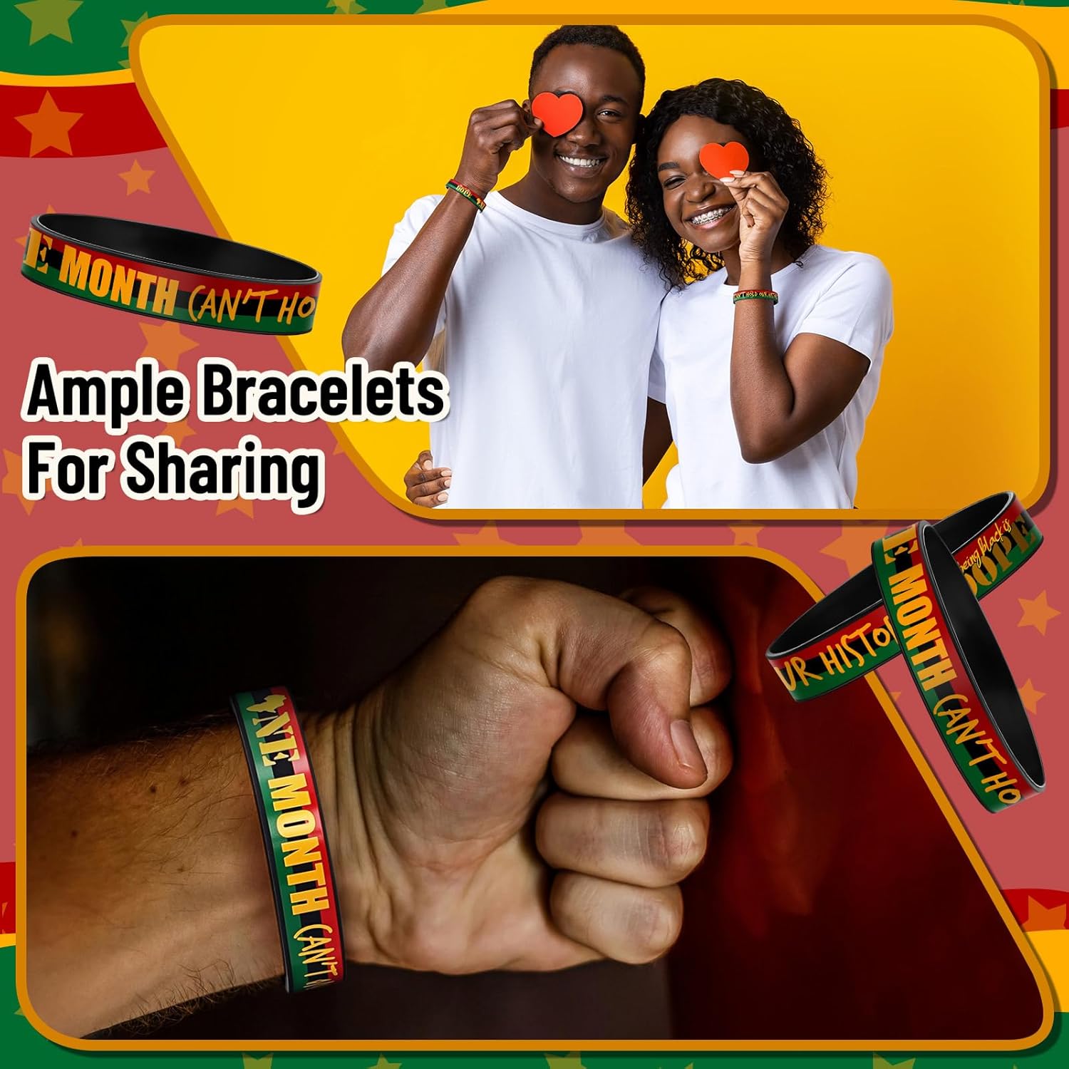 Features: Celebrate Black History Year Round More than a Black History Month accessory, these wristbands promote ongoing awareness, pride, and conversations about African American history beyond a single month. Designed for Group Impact & Education Ideal for classrooms, churches, and community programs, these Black History Month wristbands support learning, discussion, and collective cultural expression. Specifications: Material: durable and soft silicone Color: multi-color, featuring world flag designs Size: 7.95 x 0.47 inches (20.2 x 1.2 cm) Package includes: 1000 silicone wristbands Notes: Manual measurement, please allow slight errors on size. The color may exist a slight difference due to different screen displays