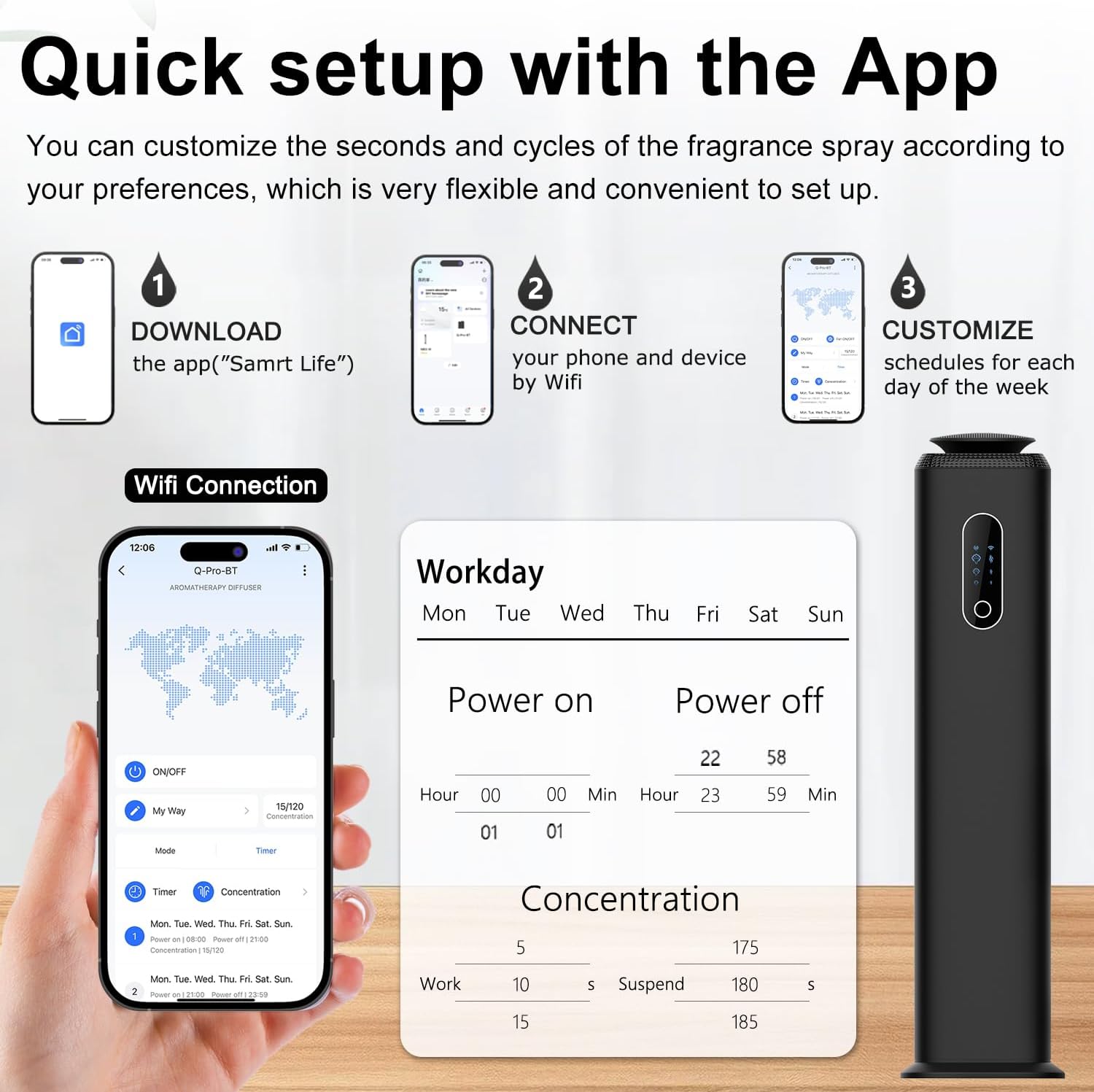 | Additional Features | 1000ml Commercial Large Tower Scent Diffuser Machine, Hotel Scent Diffuser for Whole House, Long Lasting Aroma, Timer Setting, Wi-Fi Connection Diffuser for Large Space |