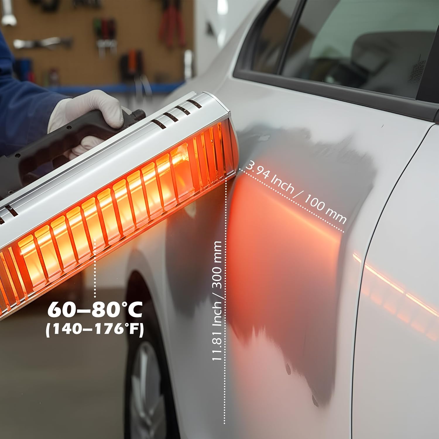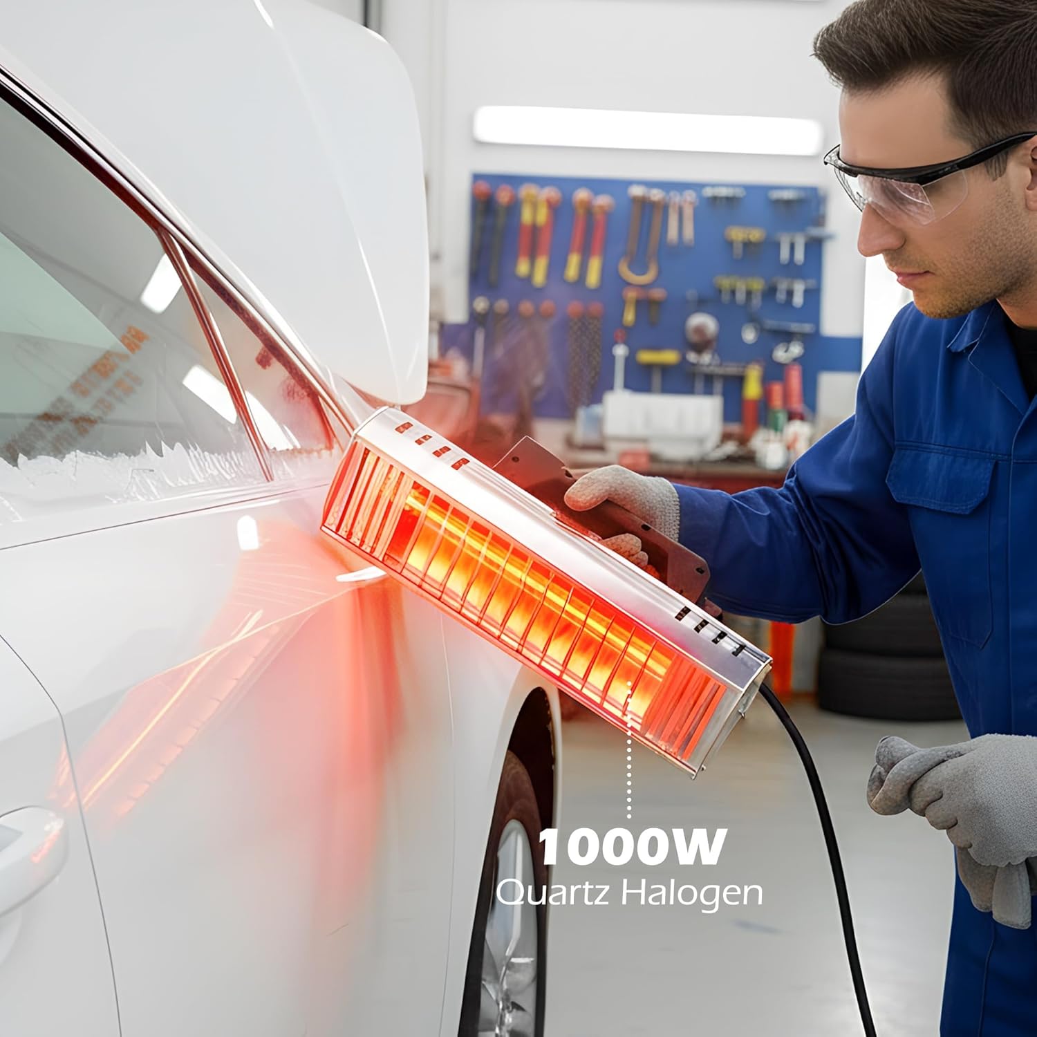 Powerful shortwave infrared heat lamp: 1000W quartz-halogen lamp delivers strong penetrating heat that dries coatings from the inside out for better gloss and adhesion, free of wrinkles, tears and reworkFast curing performance: Infrared curing lamp heat lamp can heat a work area up to 300*100mm (11.8*4.0in); operating temperature reaches 60–80°C (140–176°F). Up to 3× faster than many traditional drying methodsHandheld, one-handed design: Lightweight aluminum-alloy frame with rocker switch for simple one-handed operation, ideal for targeted spot repairs, pro and DIY auto body work where fast, even drying and controlled heat are requiredBuilt for durability and dissipation: Front mesh and rear grilled aluminum alloy sheet improve heat dissipation and longevity of this IR paint baking drying toolAuto body tool vinyl wrap drying baking lamp is ideal for auto paint booths, spot repairs, drying putty/primer/filler, vinyl wrap and carbon-fiber film baking, adhesive stripe removal and preheating before sprayingApplicable toLocalized paint drying and spot repairs in auto body shopsPreheating surfaces before spraying or wrapping (vinyl/carbon fiber film)Drying filler, primer, putty and small-area coatingsSoftening and removing adhesive strips or vinyl wrapEngine bay drying and targeted component heatingSPECIFICATIONMaterial: Quartz Halogen Infrared Lamp, Aluminum Alloy FrameSupply Voltage: AC110VPower: 1000WOperating Temperature: 140-176℉ (60-80°C)Curing Area: 11.8*4.0in (300*100mm)Lamp Tube Length: 9.8in (250mm)Recommended Working Duration: <= 60 minutesPower Cord Length: 7.2ftDimensions: 12.2*3.2*3.8in (310*80*97mm)Net Weight: 2.9 lb (1.3kg)PACKAGE1 x 1000W Infrared Paint Curing Lamp (US Plug)1 x Instructions