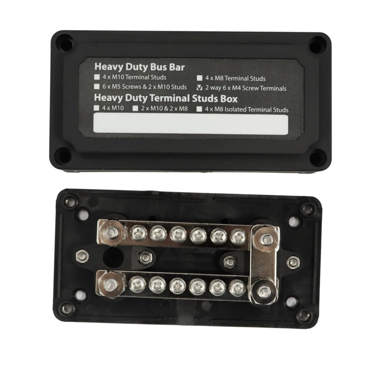 Package List 1 bar Characteristics - Color: Black bus bar box - Operating Voltage: DC 48V boat Power Distribution Block - Material: Nylon and Glass Fiber and Brass Power Distribution Block with cover - Size: 13.9x7x4.6cm - Terminal Size: 4 x (1/4") - Max Continuous Amp: 100A - Screw Size: 12 x (5/32") - Module for easy wiring configurations car Power Distribution Block. - Removable for convenient wiring car bus bar with cover. - Glass fiber reinforced nylon base and enclosure for great mechanical strength and durability. - High current rated bus bar (100A) with terminal studs.Goods Informationcar Power Distribution Block This item is a High current rated bus bar (100A) with terminal studs.Power Distribution Block with cover High current rated bus bar (100A) with terminal studs and removable for convenient wiring.boat Power Distribution Block Glass fiber reinforced nylon base and enclosure for great mechanical strength and durability