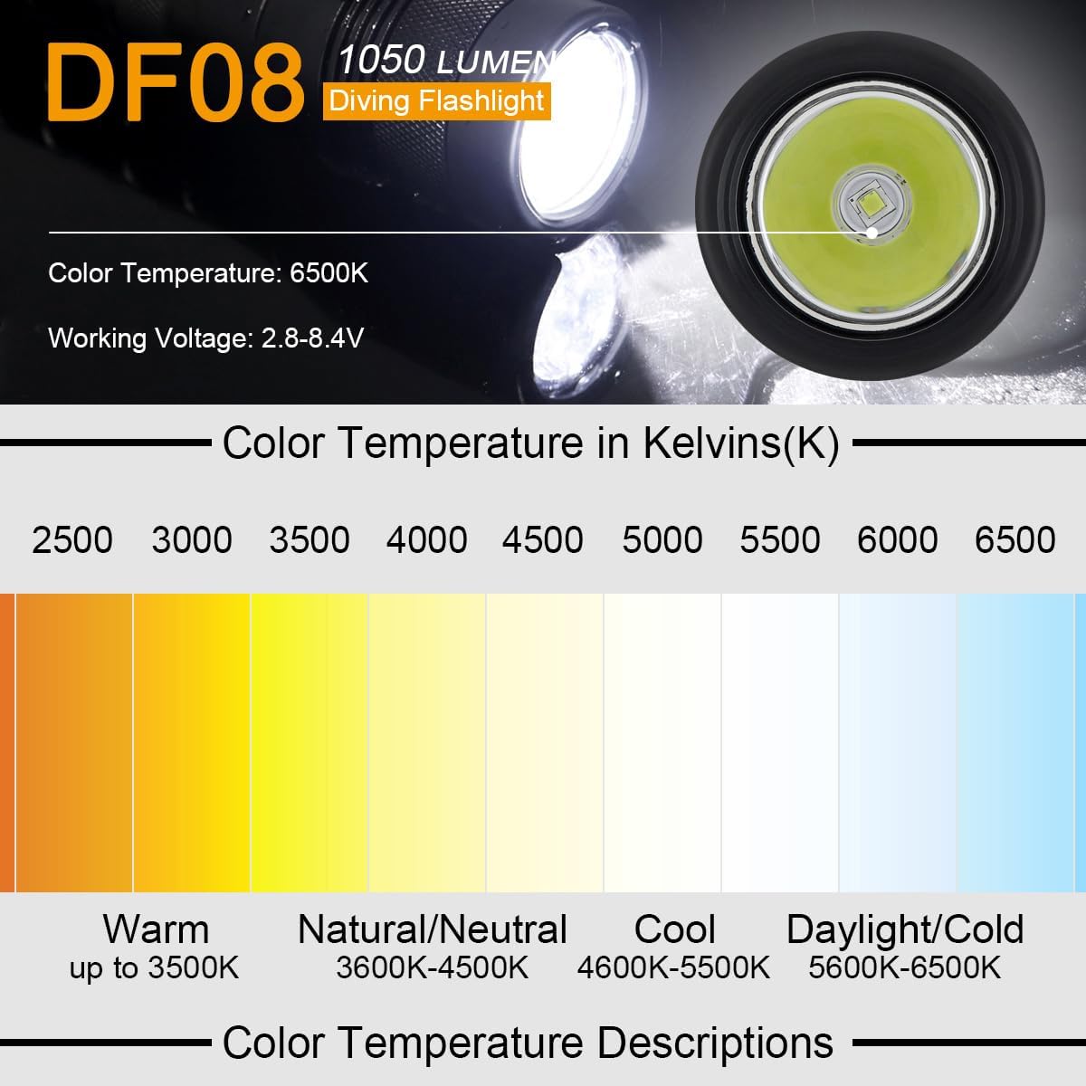 Brand: SecurityIng - Explore The Unknown Diving Flashlight: - Color: Titanium - Material: Aircraft-grade Aluminum Alloy - Lens Type: Glass Lens - Mode Memory: NO - Reflector Type: Aluminum Smooth Reflector - Switch Placement: Head - Switch Type: Rotatable Switch - Tail Stand: No - Waterproof Level: IP68 - Underwater Depth: Up to 150m - Visible Distance: 320m - Anti-drop Height: 1.5m Electronic Components: - Circuit Board: Constant Current Scheme - Output Current: 2.8A - Working Voltage: 3-8.4V - Reverse Polarity Protection: Yes LED: - Type: XM-L2 - Quantity: 1 - Luminous Flux: 1000lm - Lifespan: 50,000 hours - Lighting Source: LED - Color Temperature: 8000K - Lighting Intensity: 25000cd Power & Batteries: - Battery Included: No - Time of Duration: 7 hours Dimensions: - Length: 210mm/8.27in - Head Diameter: 46mm/1.81in - Tail Diameter: 32mm/1.26in Net Weight: 298g/10.5oz Notes: Please make sure that the voltage of battery is not more than 4.5V. Do not try to use 26650 rechargeable battery. Package Includes: 1 x LED Diving Flashlight
