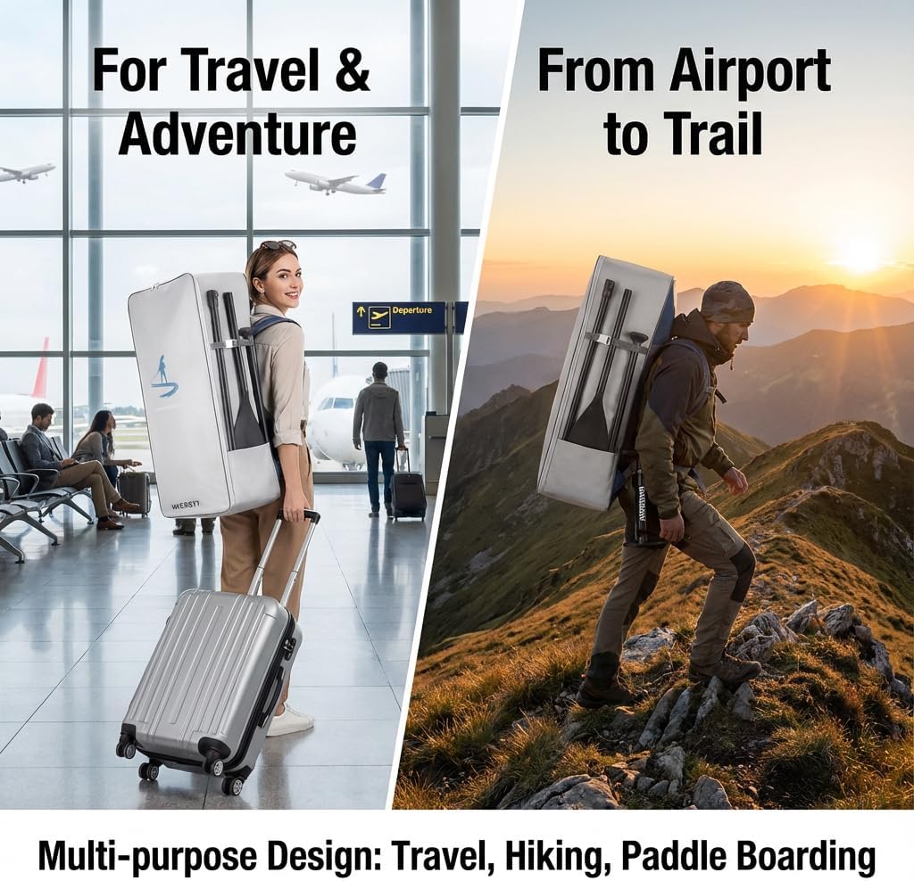 The inflatable paddle board travel backpack is lightweight, durable, and portable, and has a very large capacity, making it ideal for carrying an inflatable paddle board.Specifications: Material: Oxford cloth, PVC Capacity: 105L Size: 94*40*28cm/ 37*15.7*11in Package size: 41*33*2cm/ 16.1*13*0.8in Weight: 800g/ 28.2ozPackage List: 1 * Paddle Board Backpack