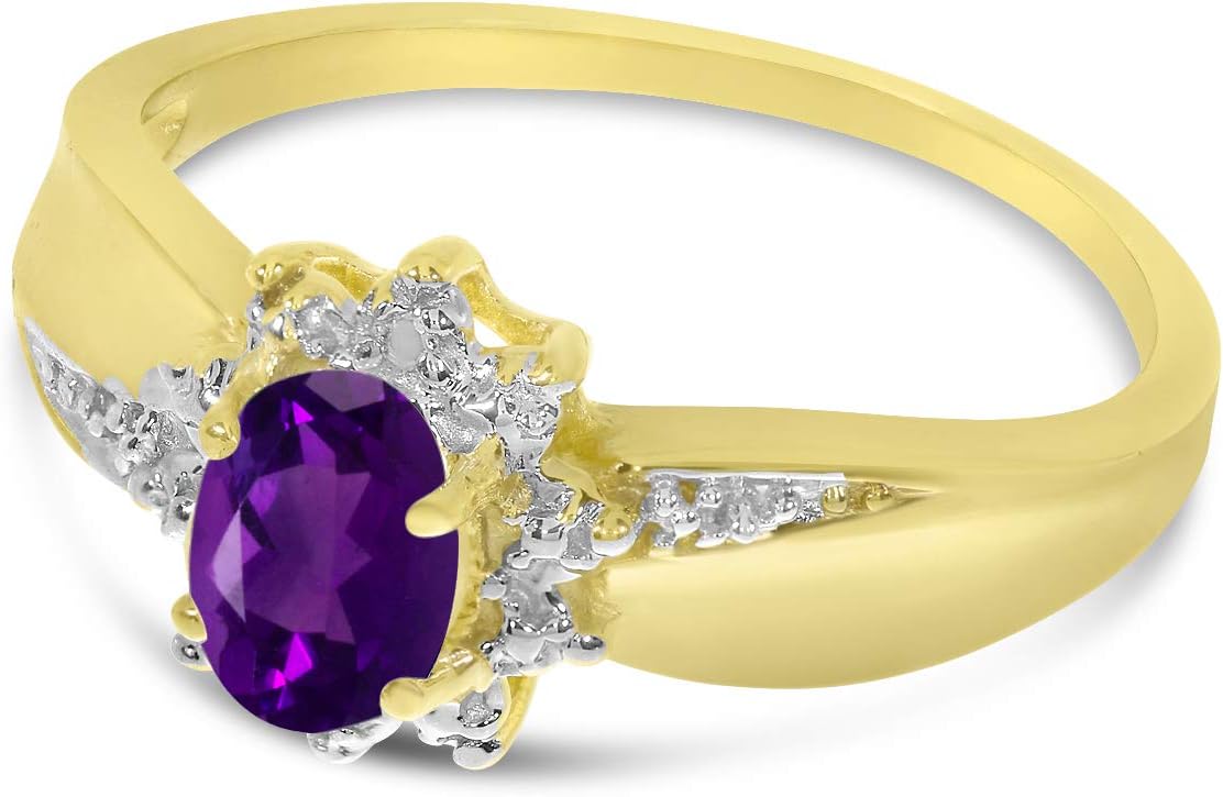 This 10k yellow gold oval amethyst and diamond ring features a 6x4 mm genuine natural amethyst with a 0.34 ct total weight.