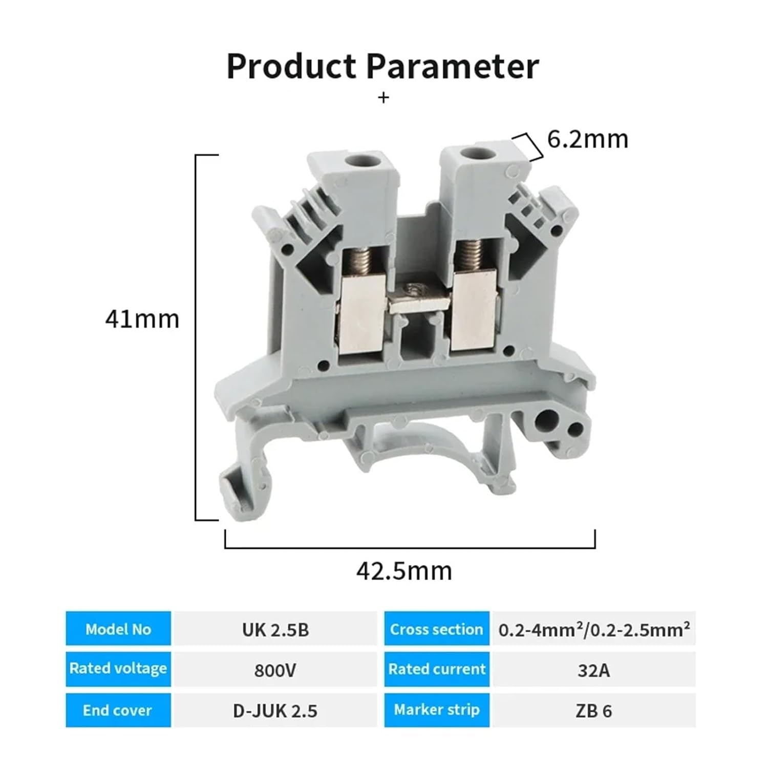 Disconnect BlocksConductor size: 24-12AWGModel: UK 2.5BType: ScrewOrigin: Mainland ChinaCertification: CE, RoHSApplication: SwitchboardApplication: Wire conductorConnection method: screwMounting Type: DIN RailDimensions Length/Height/Width: 42.5/41/6.2Current: 32AVoltage: 800VSolid cable cross section: 0.2-4mm2Wire cross section: 0.2-2.5mm2