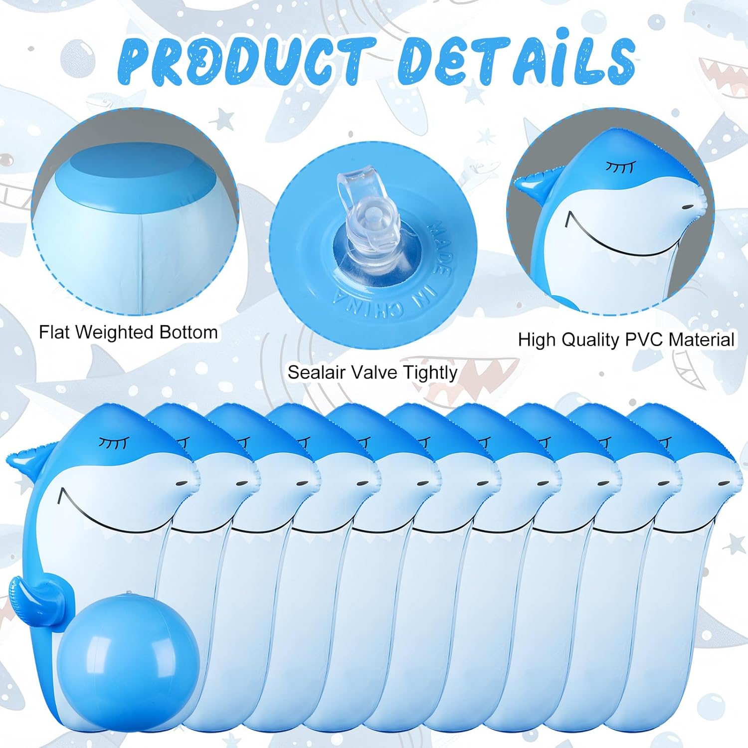 Features: This inflatable bowling set is designed for both indoor and outdoor use, making it a addition to any playtime activities, whether setting it up in the backyard during summer, at the beach, or in a playroom, the set adapts well to various settings, ensuring that fun can be had regardless of the season or location. Playing with the shark inflatable bowling set not only provides entertainment but also promotes motor skills development and educational learning, the activity teaches about numbers, letters, and shapes through the fun of bowling, enhancing their cognitive skills while they play, as the set encourages active learning playfully, making it a valuable addition to any collection. Specifications: Material: PVC Color: blue Size: Shark Inflatable Bowling Pins: 27" X 9" Shark Inflatable Bowling Ball: diameter about 23" Package includes: 10 X Shark inflatable bowling pins 1 X Shark inflatable bowling ball Notes: Manual measurement, please allow slight errors on size. The color may exist a slight difference due to different screen displays