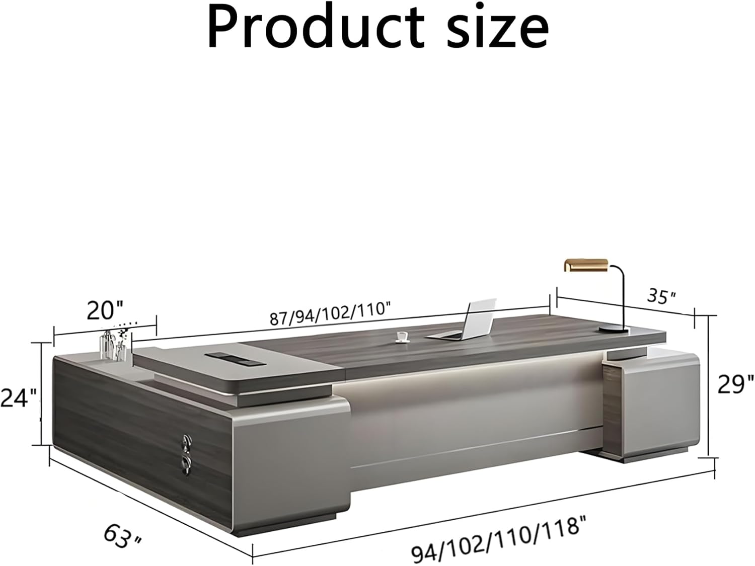 118"L Office Desk L Shape, L Shaped Executive Desk with Shelves and Storage Cabinet, Computer Desk Working Table Specification: Name:Office Desk L Shape Color:As shown Size: 102"Lx63"Wx29"H 94"Lx63"Wx29"H 87"Lx63"Wx29"H 79"Lx63"Wx29"H 71"Lx63"Wx29"H 63"Lx63"Wx29"H Package includes: 1Pcs * L Shaped Executive Desk Notice: 1. The color of the actual product may differ from the image due to the lighting or the monitor’s display. 2. Manual measurement has been used, there may be some reasonable error. 118"L Office Desk L Shape, L Shaped Executive Desk with Shelves and Storage Cabinet, Computer Desk Working Table