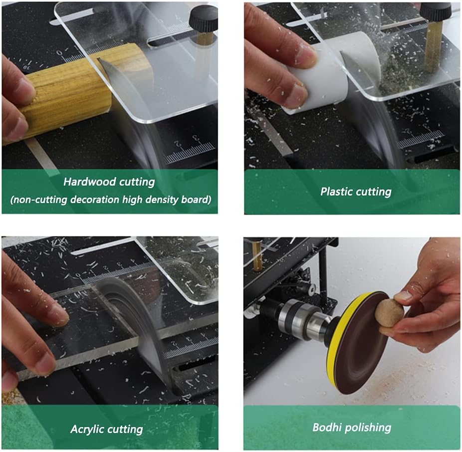 Feature: Aluminum alloy plate scale.Angle and length scale, double label.Transparent protection, acrylic board. You can see the whole production process and enjoy the fun of DIY.Equipped with four rubber damping pads, anti-skid and shock absorption during work.3 in 1 function: cutting, polishing, engraving.Motor maximum rotating speed up to 7200RPM providing ultras strong cutting powers but low noise, you can use it just at home. Specification:Table saw size:240×220×100mm Motor speed: 10000r/min Maximum saw blade diameter: 125mm Adapter power supply: 12-24V Output speed: 1000-3000r Chuck range: 1.5-10mm Flexible shaft chuck range: 0.3-4mm Maximum cutting depth: 40mm Standard cutting depth of this machine: 35mm Angle cutting function: 0-90° angle can be cut Working current: 8-20A Package Included: 1 x Table saw kit