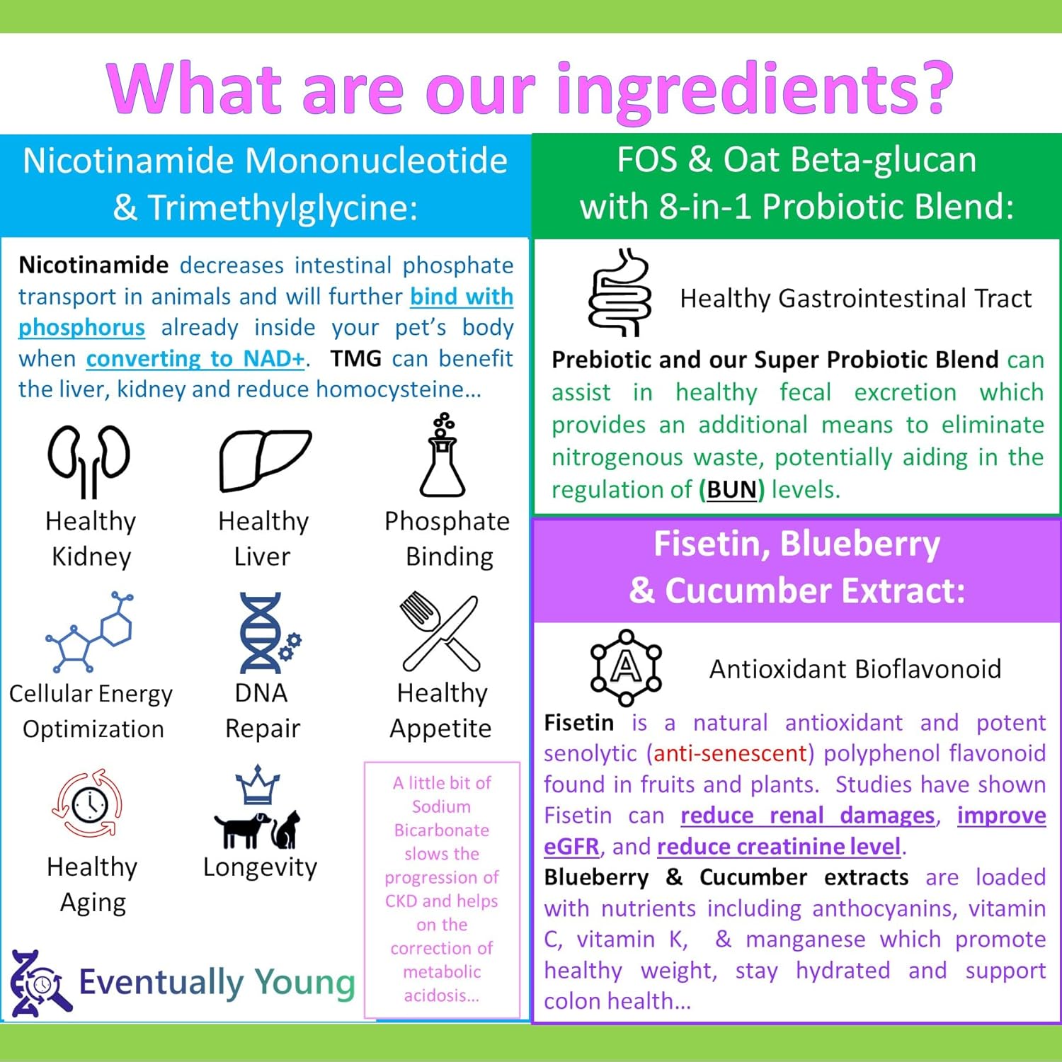 | Product Benefits | Kidney Liver Health, Phosphate Binder, Antioxidant, increase appetite & water intake, GI Urinary Health, Cellular Energy Optimization, DNA Repair, Healthy Aging, Longevity |
