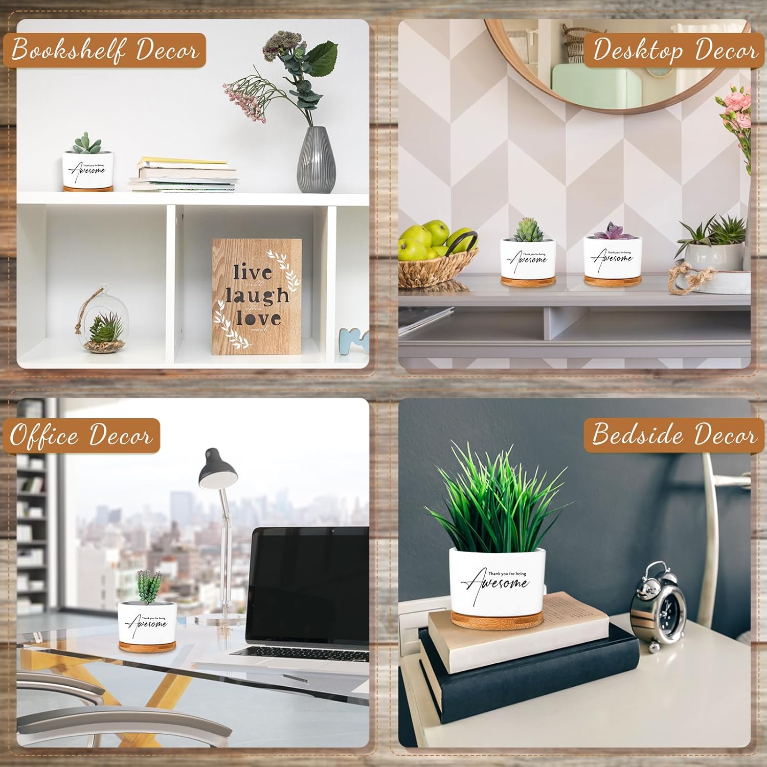 Features: These small succulent pots are suitable for most kinds of small plants and flowers, making you feel happy, and they are applicable for placing on the windowsill, shelf, balcony or table in office or at home. There is a drainage hole at the bottom for water draining and air flowing, besides ceramic plant pots can catch water drips without getting your table wet, convenient for your table cleaning. Specifications: Material: ceramic and bamboo Color: as shown Size: approx. 8 x 6 cm/ 3.15 x 2.36 inches in diameter and height Bamboo tray: about 3.54 x 0.39 inches/ 9 x 1 cm Package includes: 12 x Ceramic flower pot with bamboo tray Notes: Manual measurement, please allow slight errors on size. The color may exist a slight difference due to different screen displays.