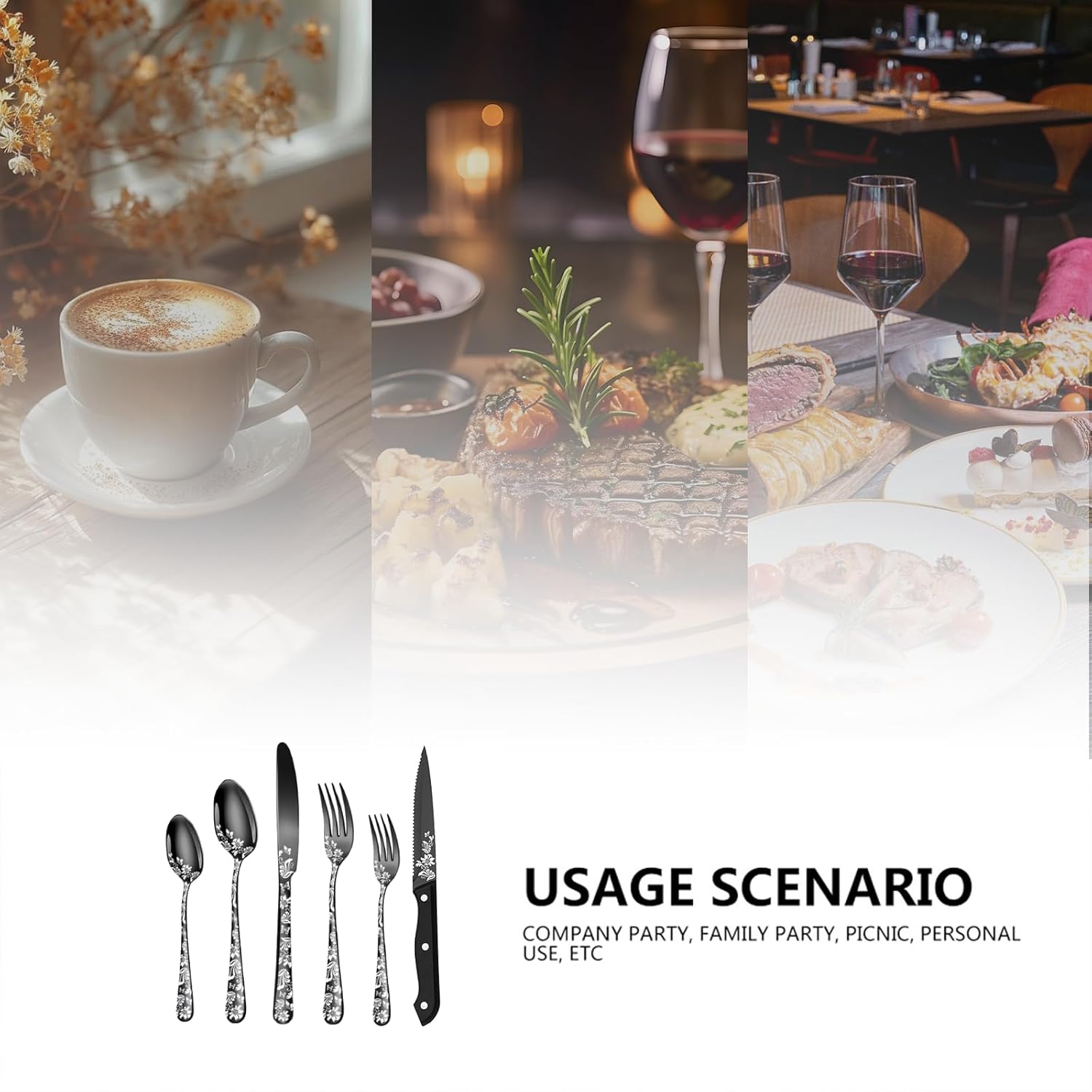 | Additional Features | Lightweight, black cutlery set, black flatware set, black silverware set, laser patterns with a classic and timeless butterfly and flower theme |