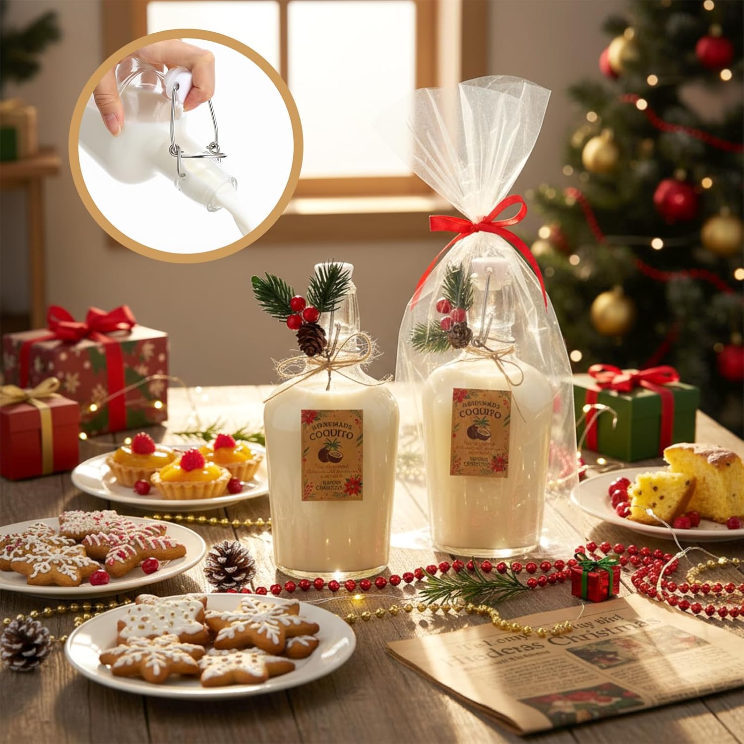 Features: Durable Structure: Strong sealing, suitable for brewing and liquid storage, supports repeated use, durable and practical Homemade Limoncello Gift Bulk: A variety of accessories are available (pine needle decorations, stickers, gift bags, ribbons, etc.), which can be personalized and customized to enhance the festive atmosphere and user experience Specifications: Material: glass Color: transparent Size: 8.5 oz Package includes: 12 x Bottles, 12 x Labels 12 x Christmas pine needle decorations, 12 x Cellophane bags 1 x Red ribbon, 1x 10 meter hemp rope Notes: Manual measurement, please allow slight errors on size. The color may exist a slight difference due to different screen displays