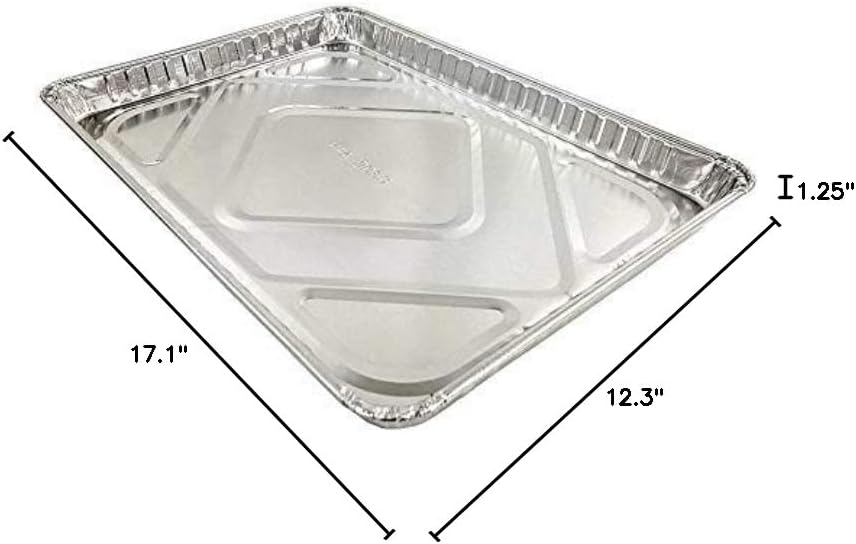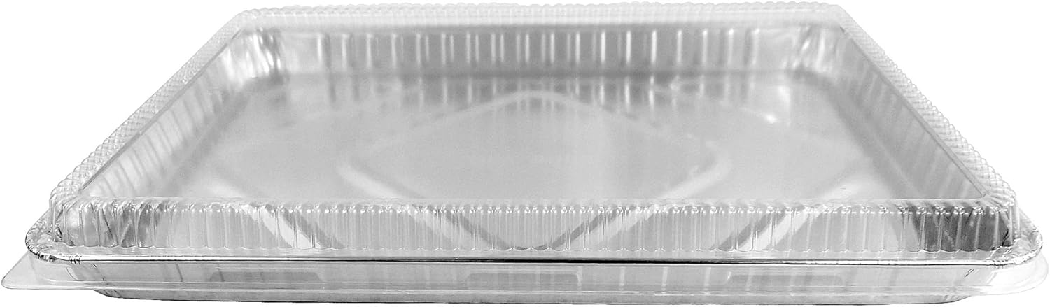 Handi-FOIL BRAND HALF-SIZE SHEET CAKE FOIL PAN W/CLEAR LOW DOME LIDS 10 PAIRS (Pack of 10 pans with 10 matching lids). 1/2 size sheet cake aluminum foil pan with clear OPS low dome lid. 10 Pans with 10 matching clear LOW dome Lids, 10 pairs total. Pan Dimensions: 17-5/8" L x 12-13/16" W x 1-1/4" D, 116 Fl.Oz Capacity. Low Dome Lid Dimensions: 18-1/32" L x 13-7/32" W x 1-1/4" H. Made with heavy duty 55 gauge aluminum. Perfect if you do not need a full case of 100. Used by many high-end restaurants, caterers and bakeries Across America. OU Kosher Certified, Made in USA.