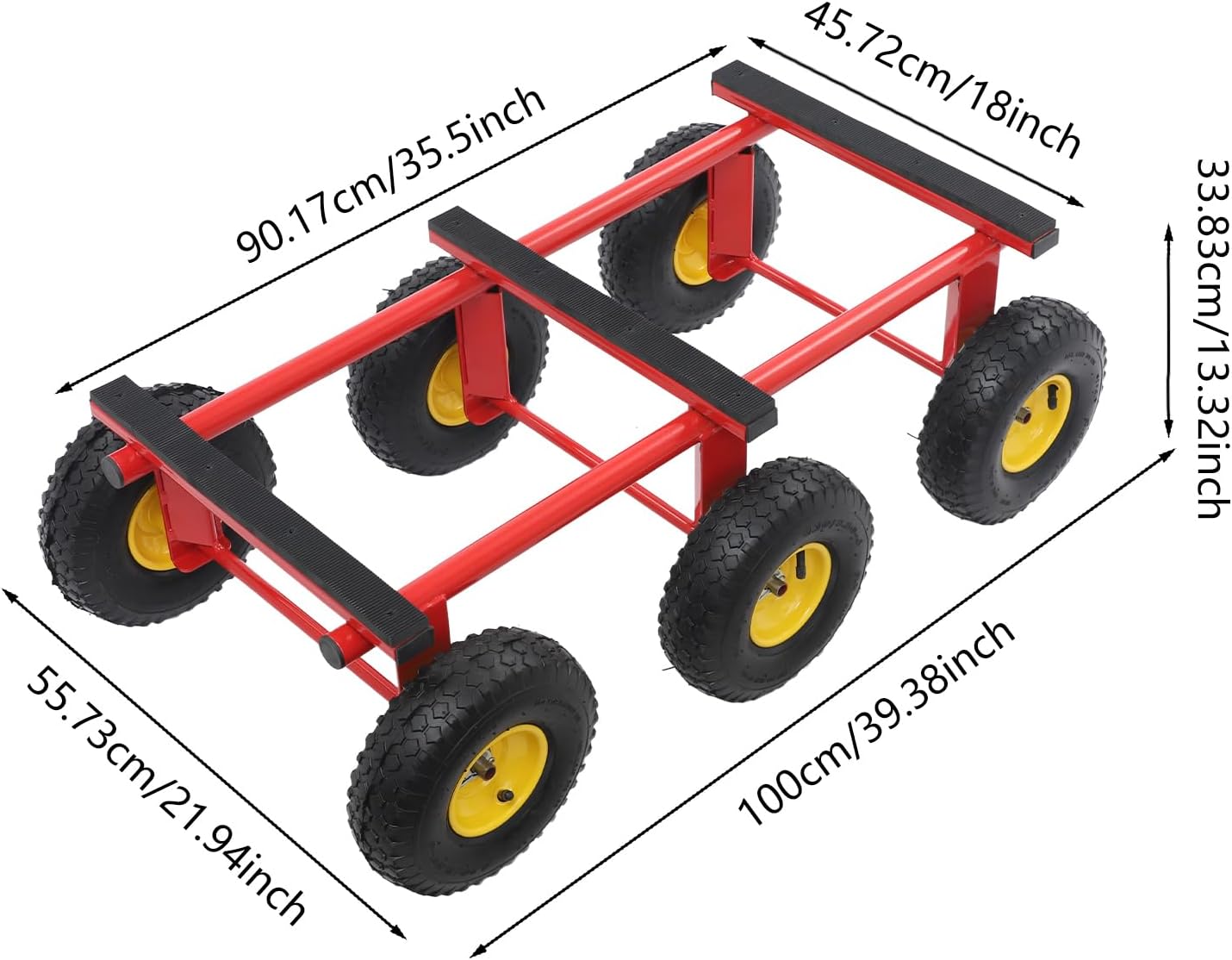 DescriptionThe dolly is a must-have for tackling tough moves with ease and confidence! Crafted from premium materials and finished with meticulous attention to detail, this dolly is built to last through tough tasks. With its outstanding load-bearing capacity, you'll be able to transport hefty items without breaking a sweat. Featuring large, flexible wheels engineered for smooth maneuverability across most terrains, this powerhouse is ready to roll wherever you need it. Your heavy-moving challenges just get a lot easier with it!DetailsStable Tyres: The tyre surface has deep, wide tread patterns for excellent grip and wear prevention. The yellow wheel rims offer structural support while enhancing stability and strength.Thoughtful End Cap: The thoughtfully designed end cap adds an extra layer of safety while acting as a powerful shield against dust and debris.ApplicationIt can be widely used in homes, logistics, decoration, warehouses, shopping malls, and other places for moving large, heavy objects and daily furniture.SpecificationColor: Red, BlackStyle: ModernMaterial: Carbon Steel, RubberProcess: Welding, Plastic SprayingAssembly Required: YesWheel Type: Inflatable Mount Type: Floor StandingLoad Capacity: 544.31kg/1200 lbsWheel Diameter: 25.4cm/10inNumber of Wheels: 6 Frame Size(L*W): 90.17*45.72cm/35.5*18inProduct Size: 100*55.73*33.83cm/39.38*21.94*13.32inPackage Size: 93*54*25cm/36.61*21.26*9.84inGross Weight: 18.6kg/41 lbsNet Weight: 17.67kg/39 lbsPackage Included1 x DollyOther Required Accessories Notes1.Please carefully check if the size is suitable before placing an order.2.Please make sure that the weight of the load is placed evenly on the dolly. Please do not work on slopes, do not carry heavy objects with an unstable center of gravity, and do not load them fully when using.3.Please allow the slight color difference caused by the shooting light and a 1-3 cm error due to manual measurement, and make sure you do not mind before ordering.