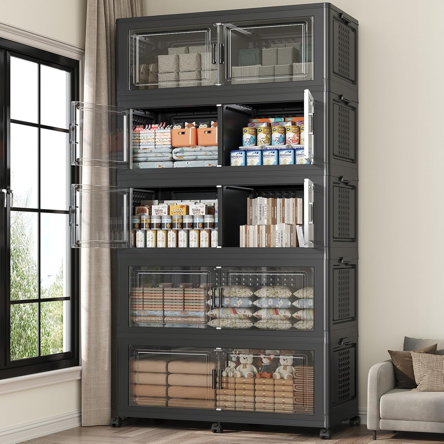 Introducing the KuyiGame 200Gal Extra Large Storage Bin—an all-in-one organizing solution designed to maximize space and versatility, featuring a total capacity of 200 gallons (equivalent to 800 QT) across 5 tiers, with each tier offering 40 gallons (160 QT) of storage space, expandable dimensions of 29.5''L x 16.5''W x 74''H, and a robust maximum weight capacity of 110 lb. What sets this storage cabinet apart is its built-in divider on each tier, allowing you to create two separate compartments per level, perfect for categorizing and separating different items without mixing them up. Designed for ultimate convenience, this collapsible storage bin with lid and wheels offers dual ways to access your belongings: lift the top lid for full, unobstructed access to the entire tier or use the front opening door for quick, targeted retrieval—paired with clear windows on the doors, you can instantly identify contents without opening the bin, while strong magnetic lock buckles keep the front doors securely closed, effectively preventing dust from entering and protecting your stored items. Crafted with a foldable, stackable, and mobile design, this storage solution can be quickly unfolded for use or collapsed flat in just 3 minutes (achieving full storage setup in 5 minutes and flat storage in seconds) to maximize space utilization, making it ideal for small living spaces like homes, bedrooms, kitchens, offices, dorms, and apartments; the side buckles on each tier ensure secure stacking. Made to adapt to all your organizing needs, this all-in-one storage bin is perfect for storing clothing, books, snacks, bedding, sewing supplies, pillows, garage tools, crafts, cosmetics, yarn, and more, functioning as a closet organizer, garage tool shelf, clothes organizer, bookshelf, display cabinet, sewing organizer, cosmetic organizer, yarn storage organizer, or craft supply cabinet.