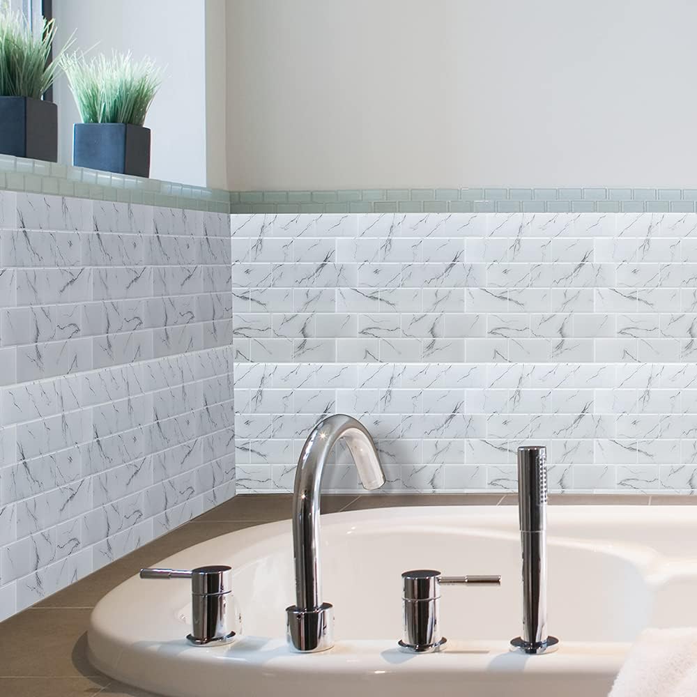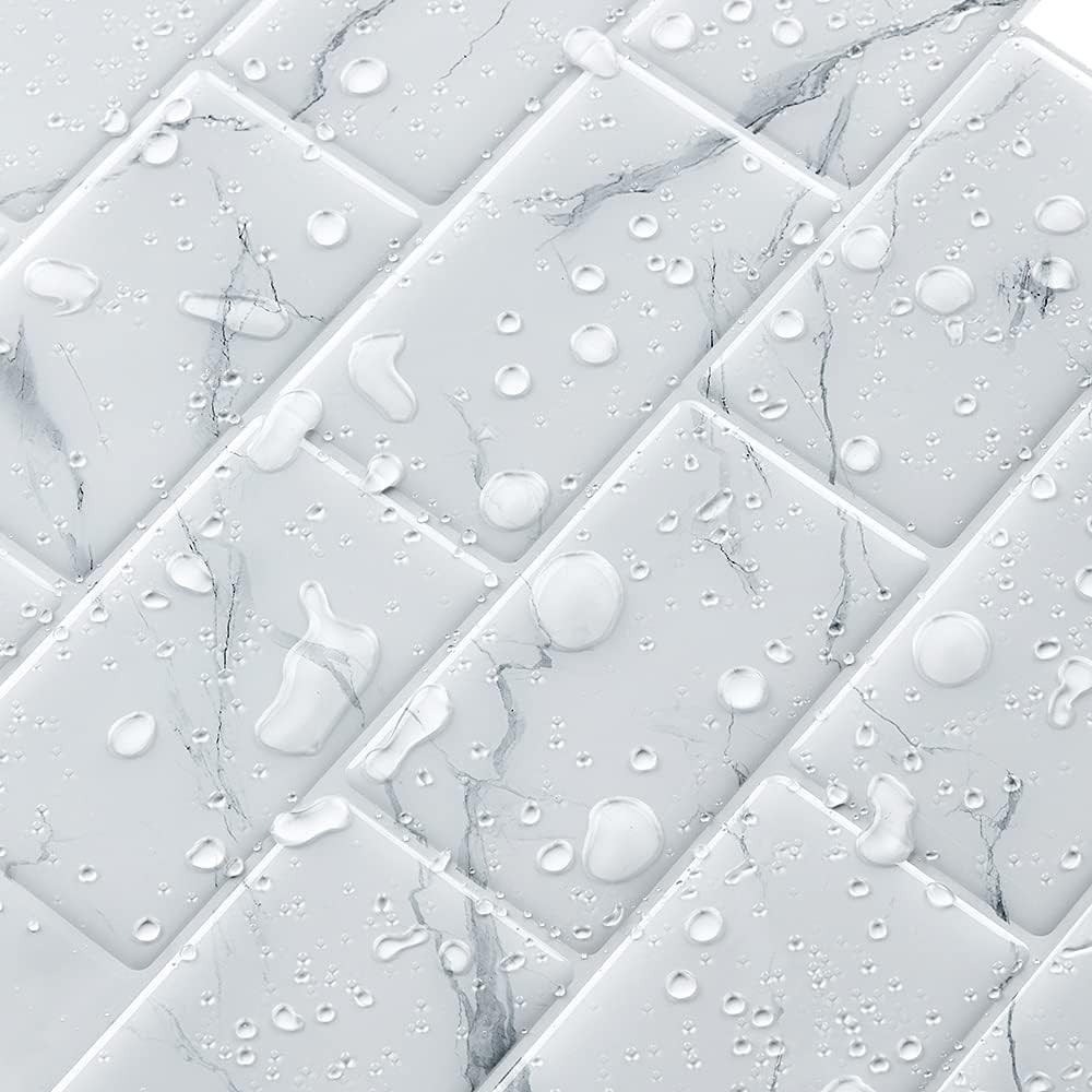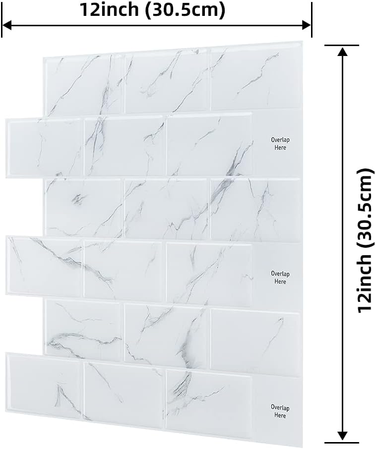 FEATURES ● Bigger size: 12"x12", A 12"x12" tile covers 40% more then a 10"x10" tile ● Made with PU gel the tiles are 3D, And will stay durable without turning yellow ● Easy to clean and maintain ● Easy to cut and trim ● Waterproof and heat resistant ● Made from eco-friendly material, Heavy-metal free ● Do it yourself, no special tools and no experience needed INSTALLATION 1) Clean the surface on which the tiles are to be pressed with sugar soap or alcohol to remove all grease and other residue. Make sure the surface is completely clean and dry. 2) Measure the whole area and lay the tiles out to replicate the area to be sure you have enough tiles for the job plus a little left over in case of mishaps. 3) With a scissor or utility knife cut the jagged side off the first tile to get a straight edge. 4) Peel off a little of one side of the tile without touching the adhesive, Install the tile on the wall starting from the peeled corner without applying pressure and slowly peel of the rest, once your happy with the position press down firmly. 5) Place the next tile the same direction on to the "Overlap Here" side. If you misplace a tile, peel it off and stick it back properly. Do not install these tiles less then 16 inches away from a stove top.