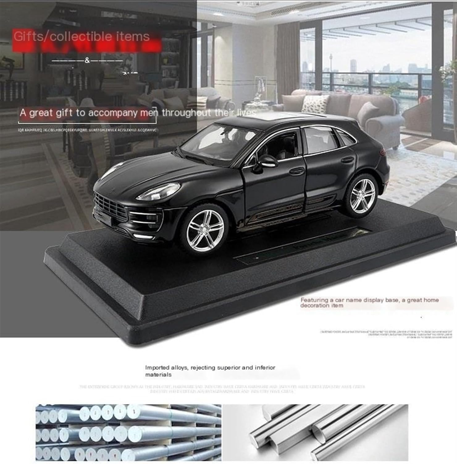 - Material: alloy- Car model proportion: 1:24- Origin: Guangdong- Product Category: car- Specifications: 1 / box- Control mode: force control- Packing: colour box- 3C configuration category: 15 years old and above toys- Colour: Macan-Black- Applicable age: youth (15-35 years old)- Unit weight: 0.503kg- Product volume: 22.9cm * 11.4cm * 10.9cm