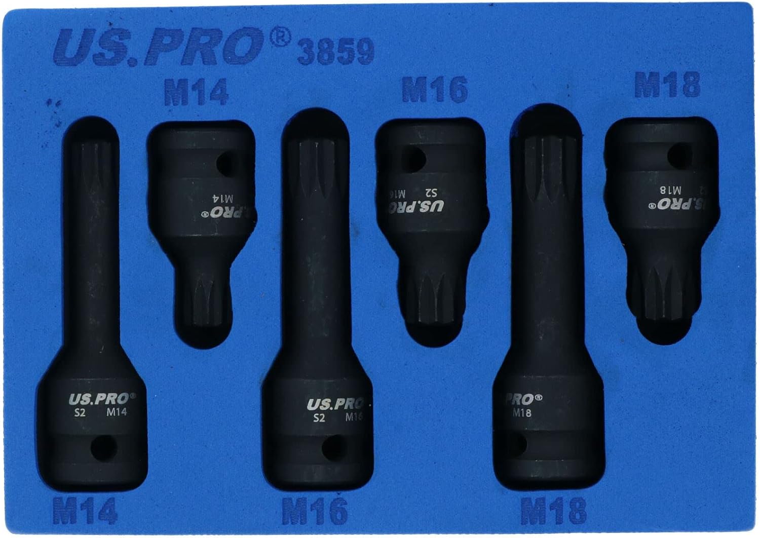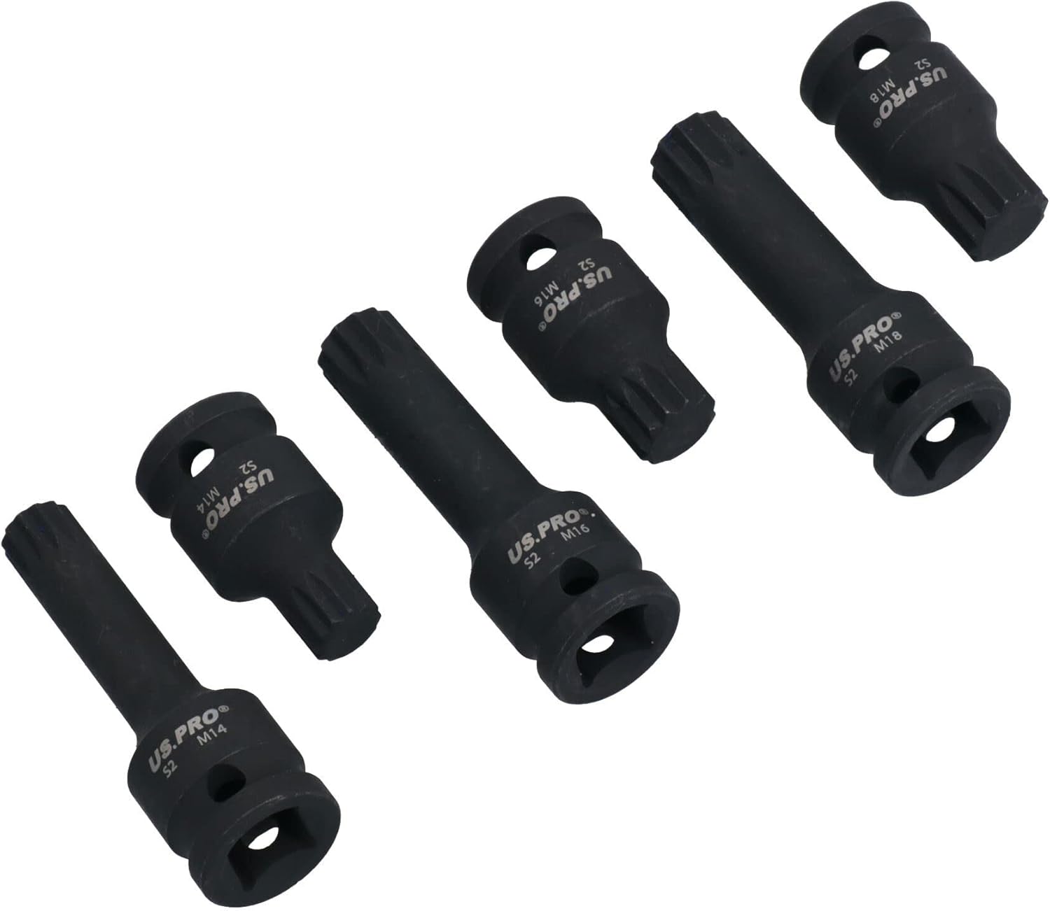 Professional spline bits for commercial or occasional use 1/2in drive impact spline bits Shallow and deep spline sockets Male spline sockets 6pc spline sockets (3 x shallow and 3 x deep) Manufactured from CR-mo steel for maximum strength and durability 1/2in drive so will fit any 1/2in drive ratchets, extensions, power bars etc... Impacted so perfect for use with high torque tools such as impact guns Shallow and deep so perfect for access in restricted or deep set areas PACK INCLUDES THE FOLLOWING SIZES 3 x shallow spline sockets (total length 45mm) – M14, M16 and M18 3 x deep spline sockets (total length 78mm) – M14, M16 and M18 Comes in an Eva foam tray for easy storage and transportation