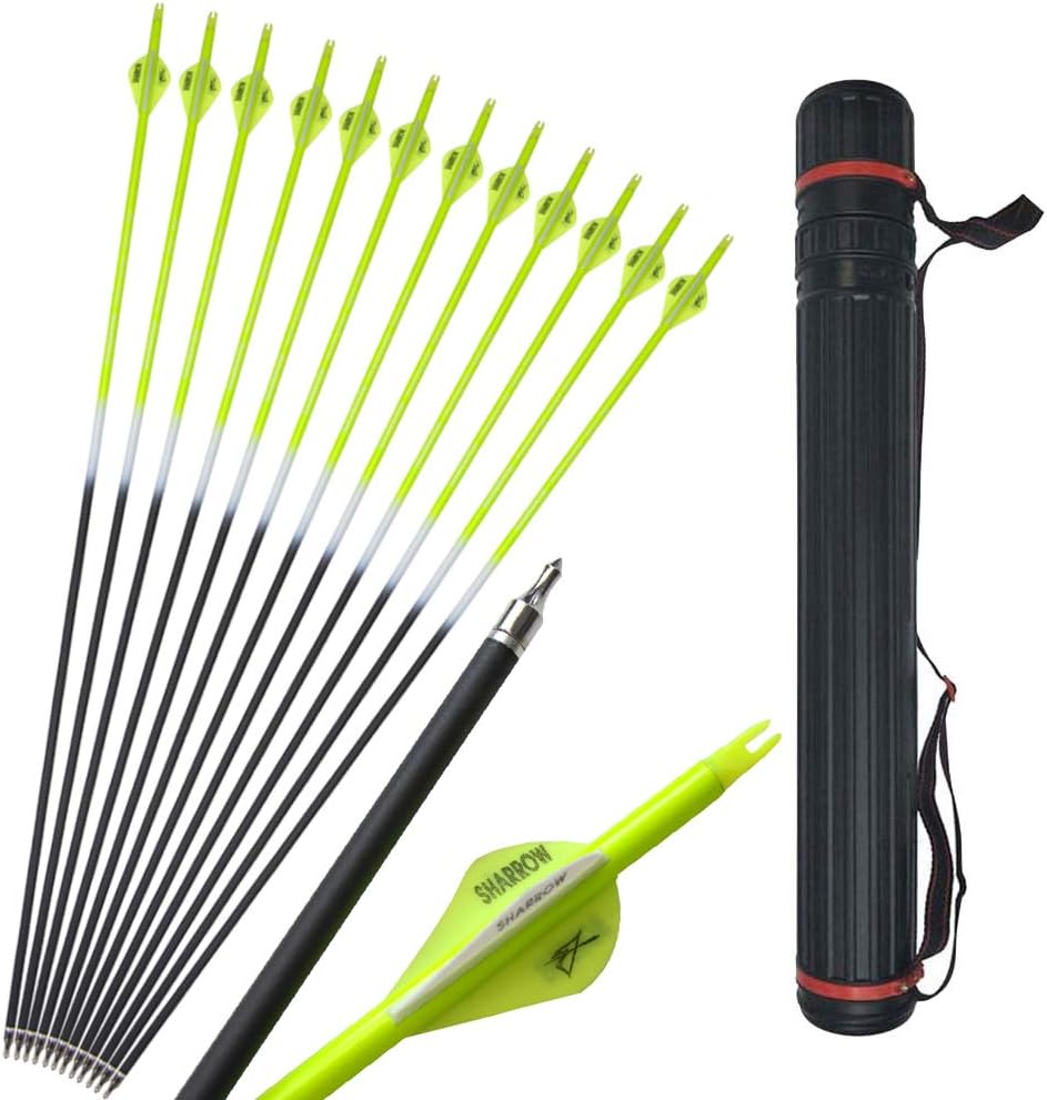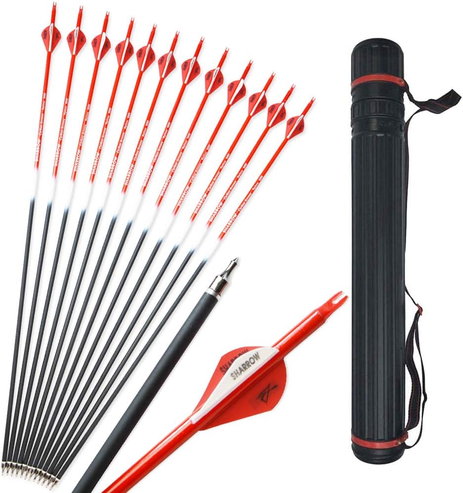 12pcs Archery Carbon Arrows Hunting Target Arrows Replaceable Steel Tips with Arrow Quiver for Recurve Bow and Compound Bow Spine 500
