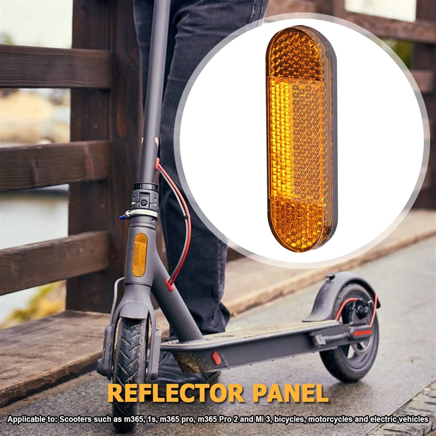 1. Reflective at night, which can effectively improve the safety index of night riding;2. The curved design can effectively fit the front fork of the scooter or bicycle;3. Double-sided tape paste, easy to install.Specification:Main body material: ABSProduct color: YellowProduct size: about 72x22x11mmProduct net weight: about 8g (single)Suitable fit for M365, 1S, M365 PRO, M365 PRO 2, MI 3 and other scooters and bicycles, motorcycles, electric vehicles