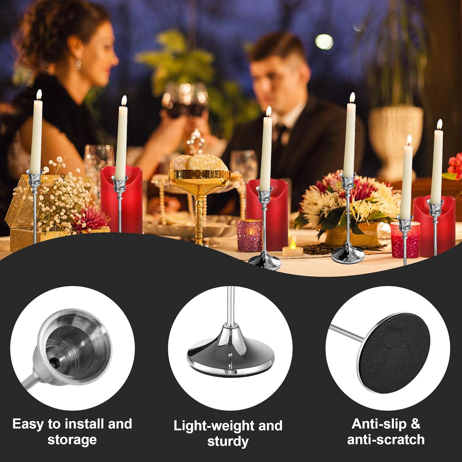 Features:[Our silver candlestick holder blend perfectly with various styles, whether used as table decorations or accent lighting. They can be placed in bedrooms, living rooms, dining tables, side tables, or coffee tables, and are also suitable as gifts for friends and family on various occasions such as birthdays, anniversaries, and Christmas.]Specifications:Material:[aluminum]Color:[silver]Size: [6.3 inches, 7.7 inches, 9.4 inches]Package includes:[12 x candlestick holders]Notes:Manual measurement, please allow slight errors on sizeThe color may exist a slight difference due to different screen displays
