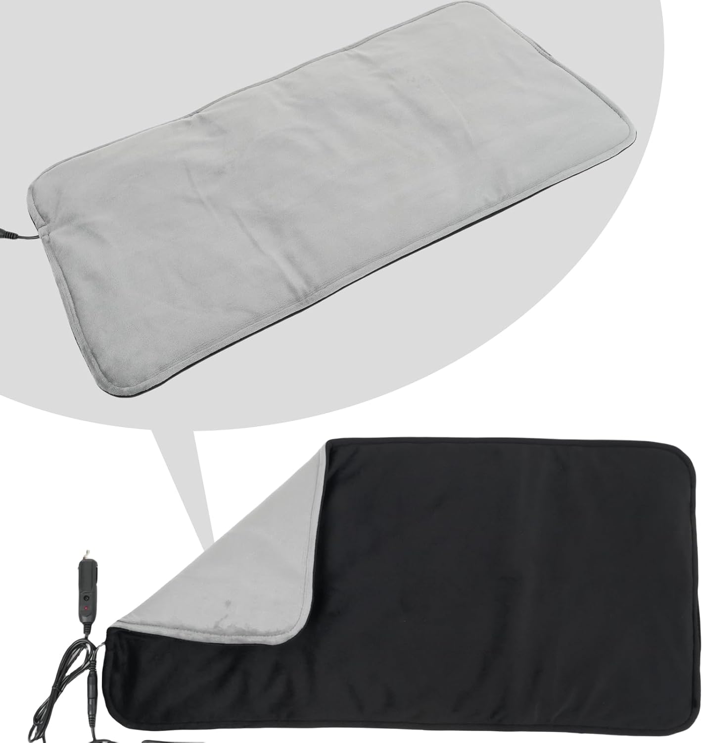 12V Car Heated Blanket ,Machine Washable Material:Double Side Crystal Velvet Size:12" x 24" Rated Voltage:12V Rated Current:3A Rated Power:36W Machine Washable,Please remove the controller before washing. Color:Black/Grey Heats up quickly,suitable for your pets,please use the lowest heating level for pets. it's great for back pain relief during long commutes,road trip and long drives.