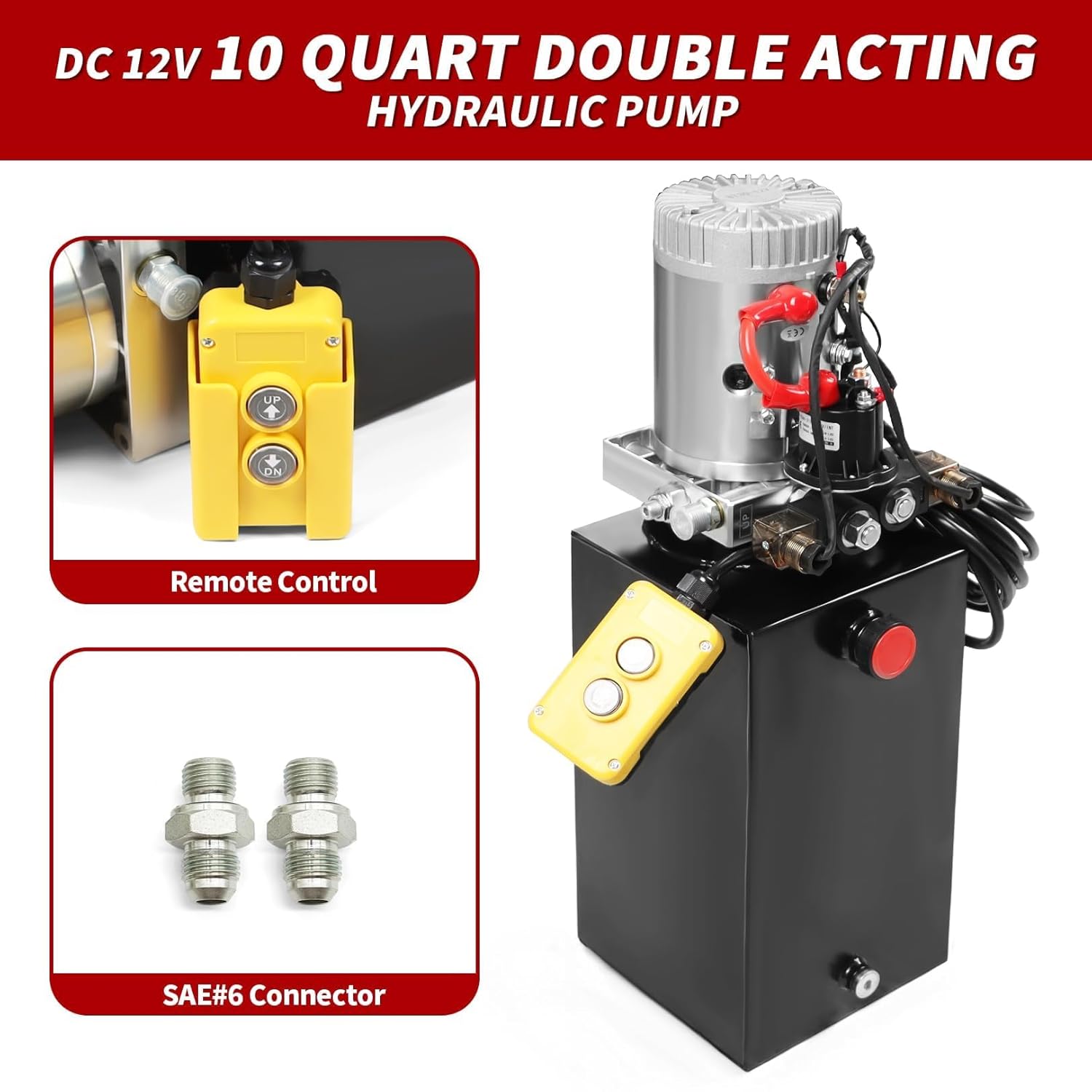 Important Parameters:Fuel Tank Capacity: 10 quartFunction: Double actingVoltage: 12V DCA Port: 3200 PSIB Port: 1500 PSIConnector: SAE # 6, corresponding to 9/16-18 UNF threadMotor Power: 1.6 KWNote:Double acting hydraulic pumps must be used together with double acting hydraulic cylinders.This product is easy to install and has excellent performance. Different models can meet your different work needs, and it also comes with a 15 foot remote control for easy remote control, improving work efficiency.