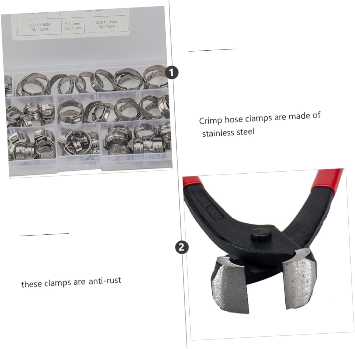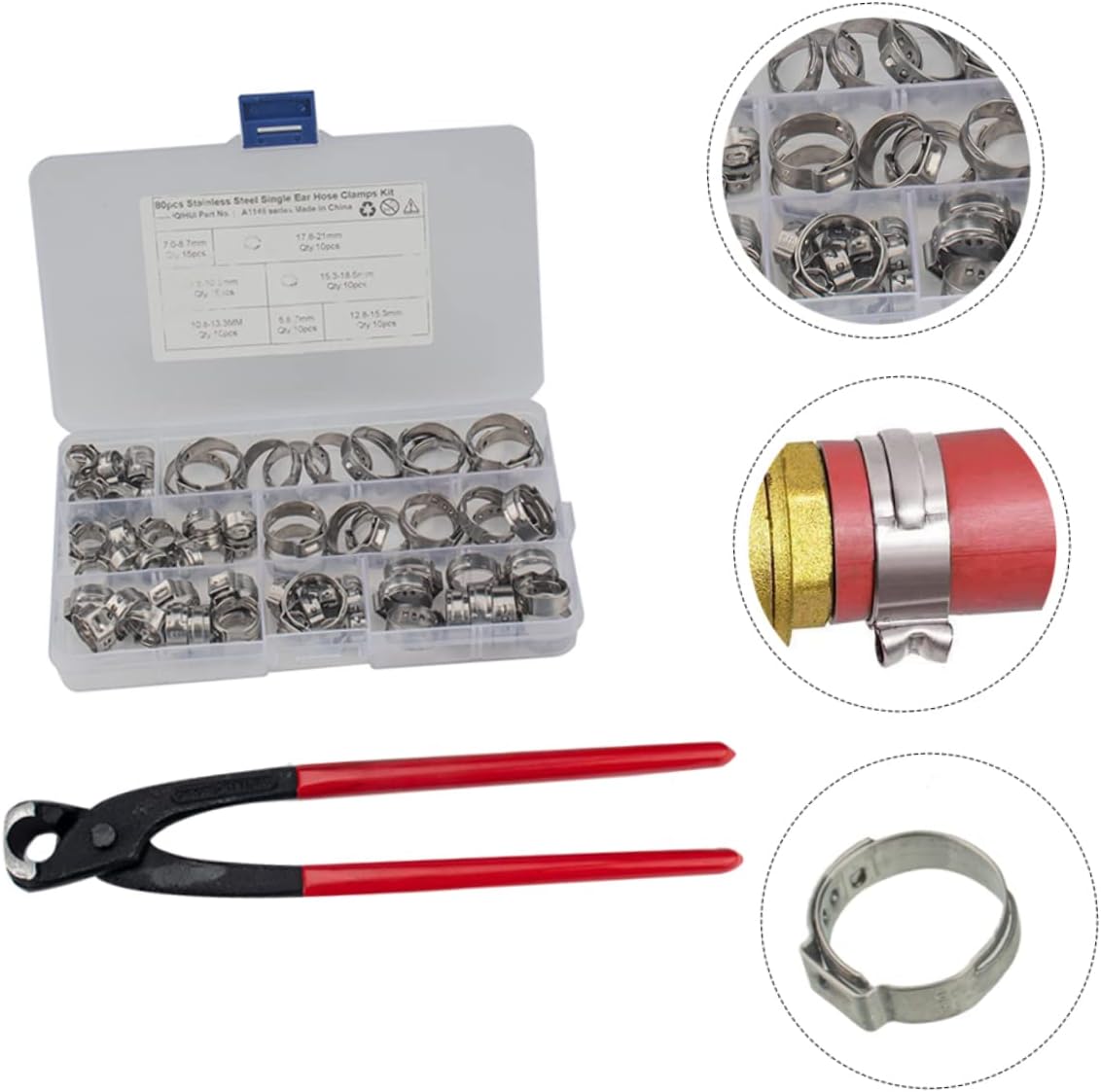 Package Include 1 x Ear Clamp Characteristics - Size:2.10X2.10X0.70cm/0.83X0.83X0.28in 5.8-21mm Hose Clamp - Color: Silver Pipe Clip. - Application: Apply to securing hoses, pipe, cable, tube, fuel lines in home applications,automotive, industrial, boat/marine etc Tube Clip - Material: Stainless steel. - Easy to loosen the screw of hose clamp by a screwdriver,then thread the pipe through the hose clamp and adjust the fit size,tighten the screw Single Ear Hose Clip - These drive clamps are made of stainless steel Stainless Steel Hose Clip. - Made of high grade material, in use - Hose clips assorted made of heavy duty stainless steel material,sturdy and , rust and corrosionGoods DescriptionStainless Steel Hose Clip The precise design will ensure its practicability in the work of high performance.5.8-21mm Hose Clamp Perfectly fit for air hose tube, water pipe, fuel pipe,silicone vacuum hose, automotive accessories fix use.Pipe Clip Perfect for or household use.Tube Clip Included 130pcs hose clamps which are made of stainless steel material for and practical use