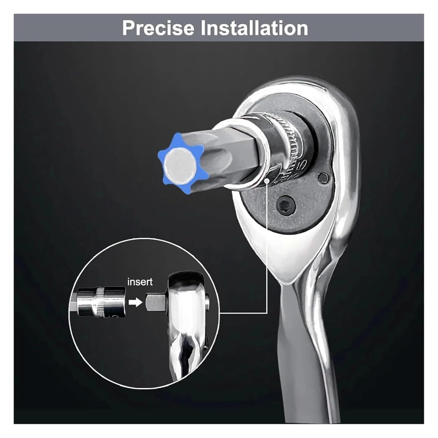 13-piece bit socket set features chrome vanadium steel forged socket and S2 steel forged bits Compatible with torque, strength, and durability.All pieces of this set securely within a durable blow-molded carry case Compatible with easy organization and convenient portability.Specification:1/4" Drive (Length 37 mm) T 8 / T 10 / T 15 / T 20 / T 25 / T 27 / T 303/8" Drive (Length 48 mm) T 40 / T 45 / T 50 / T 55 / T 601/2" Drive (Length 55 mm) T 70Package includes:13pcs * Torx Star Bit Socket Set==========Material : Chromium-vanadium SteelOrigin : Mainland ChinaWelcome to HEPINGQINXINDA We focus on auto parts sales, complete categories and reliable quality. Whether it is maintenance or upgrading, the professional team provides you with a one-stop solution. Looking forward to escorting your car!