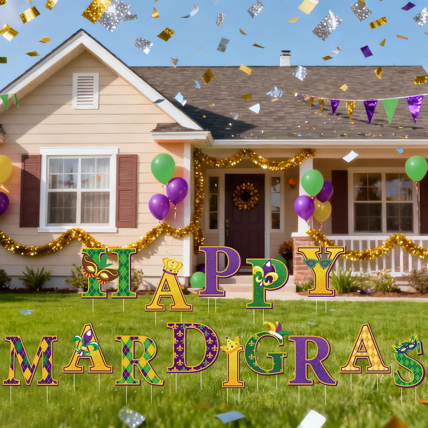 Features: Eye-Catching Yard Decor: Add parade flair to your space with Mardi Gras yard decorations that combine vibrant patterns, stable stakes, and light-up details. Each sign enhances visibility, creating a joyful celebration atmosphere that stands out day and night Photo-Worthy Carnival Backdrop: Create a colorful photo zone with Mardi Gras decorations yard signs letters and glowing accents. Whether near party entrances or along pathways, this lively display offers guests a fun, memorable backdrop for parade selfies and festive group photos Specifications: Material: Plastic Color: Multicolor Occasion: Mardi Gras, Carnival Package includes: 14 x HAPPY MARDI GRAS Yard Sign with Stakes 2x 16 Ft light strings (battery not included) Notes: Manual measurement, please allow slight errors on size. The color may exist a slight difference due to different screen displays.