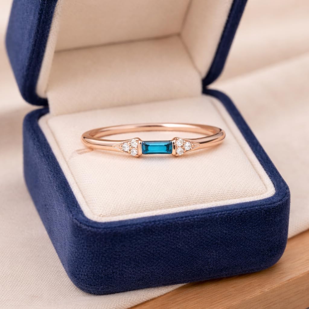 Refined, delicate, and effortlessly elegant — this 14K Rose Gold Baguette Cut Blue Sapphire Ring is designed for women who appreciate minimalist luxury. The slender band features a striking baguette-cut blue gemstone set horizontally for a contemporary touch. Sparkling diamond accents on each side add brilliance without overpowering the design. The warm rose gold setting enhances the rich blue tone of the center stone, creating a sophisticated contrast that suits both everyday wear and special occasions. Its slim profile makes it perfect for stacking with other rings or wearing alone as a promise ring, anniversary band, or modern engagement ring. Lightweight yet durable, this fine jewelry piece offers timeless beauty and versatile styling — an essential addition to any jewelry collection.