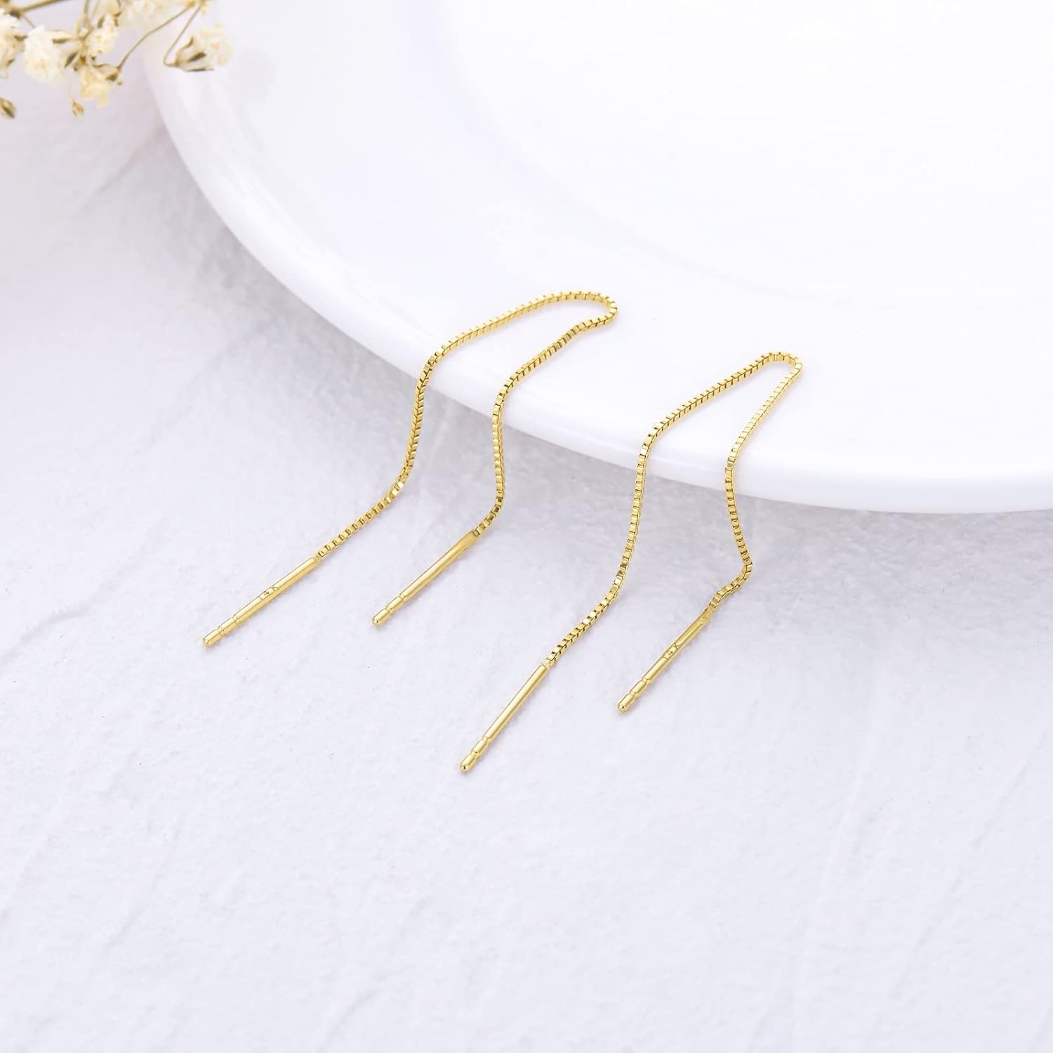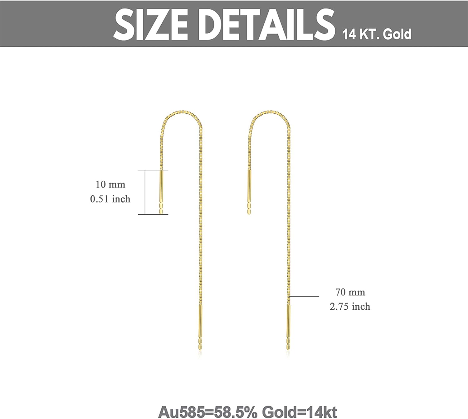 About SISGEM SISGEM Jewelry is a famous and a registered jewelry brand, committed to providing customers with high quality products and services, is renowned by its interesting and unique designs which makes the rings, bracelet, earrings and necklace ideal for both formal and casual occasions. we specializes in the whole line of fine jewelry making, Our main products are fashion 10k, 14k, 18k gold jewelry, silver jewelry and wedding diamond jewelry. There is where our mission is, we always focus on, committed to provide easy luxury and inner joyfulness to our each customer by offering premium jewelry and whole-hearted Service. “The aim of art is to represent not the outward appearance of things, but their inward significance.” - Aristotle Our most mission is , Connecting you with your loved ones always by the unique, luxurious, romantic fine jewelry designs and heartfelt Service. There is where the Love dwells. Product Specifications: Product Material: 14kt gold box chain threader earrings gold box chain length: 4cm/6cm/8cm/10cm/12cm Package Includes: 1 x 14kt gold box chain threader earrings 1 x A elegant box 1 x Gold polishing cloth Images are enlarged for a better view and are not the actual size.Refer to the product specifications information. BEST GIFTS FOR HER : This fashion jewelry makes the perfect gift for Mother's Day, Valentine's Day, Christmas, Birthdays, Engagement, Brides, Bridesmaids or Graduation for any woman, teen, children, adults, daughters, granddaughters, girlfriend, wife, fiancee or that special lady Jewelry Maintenance: 1.Avoid touching to chemicals. 2.Avoid colliding or rubbing against other very hard jewelry. 3.Avoid placing the item in a too cold or too hot environment. 4.Always wipe gently with the polishing cloth after removing it.